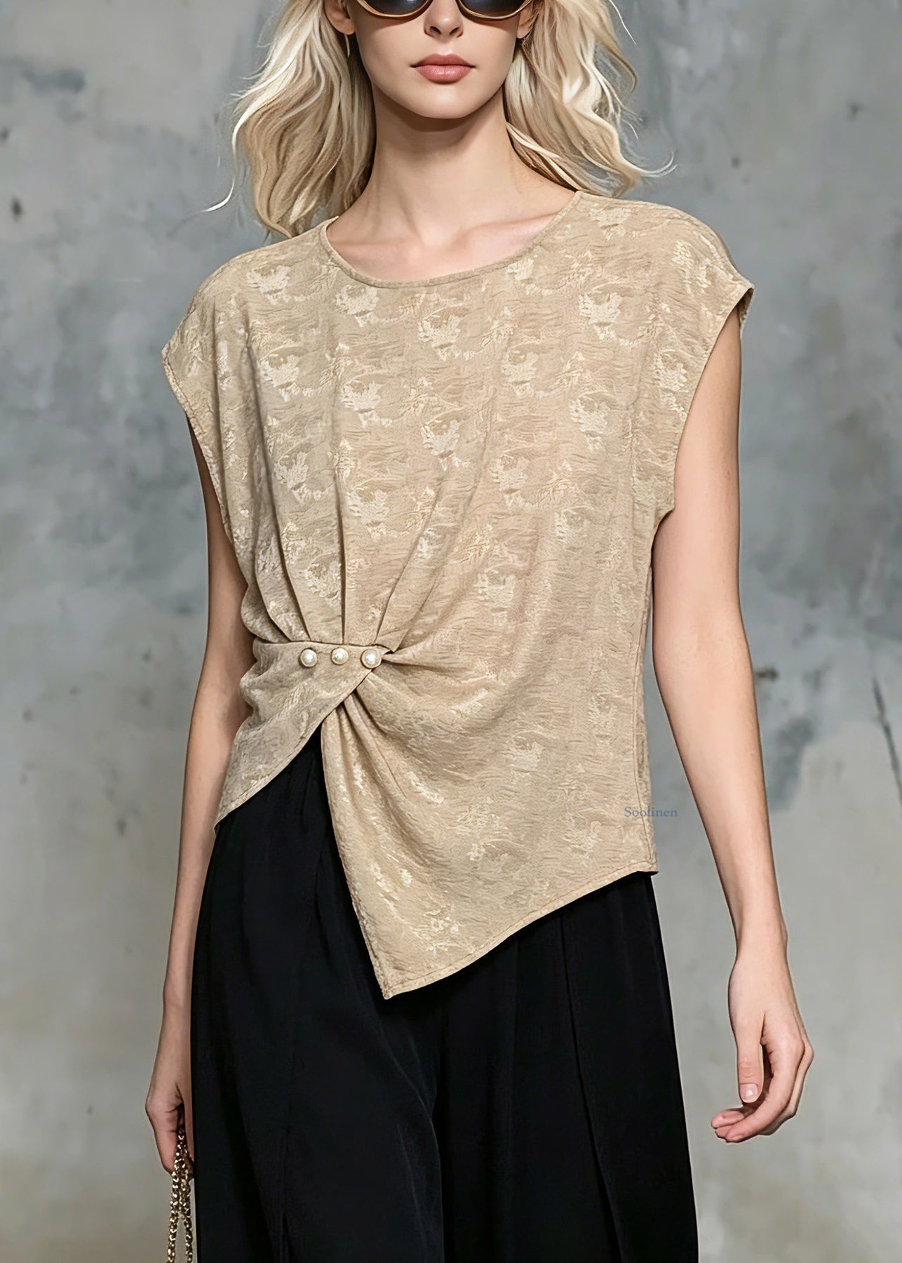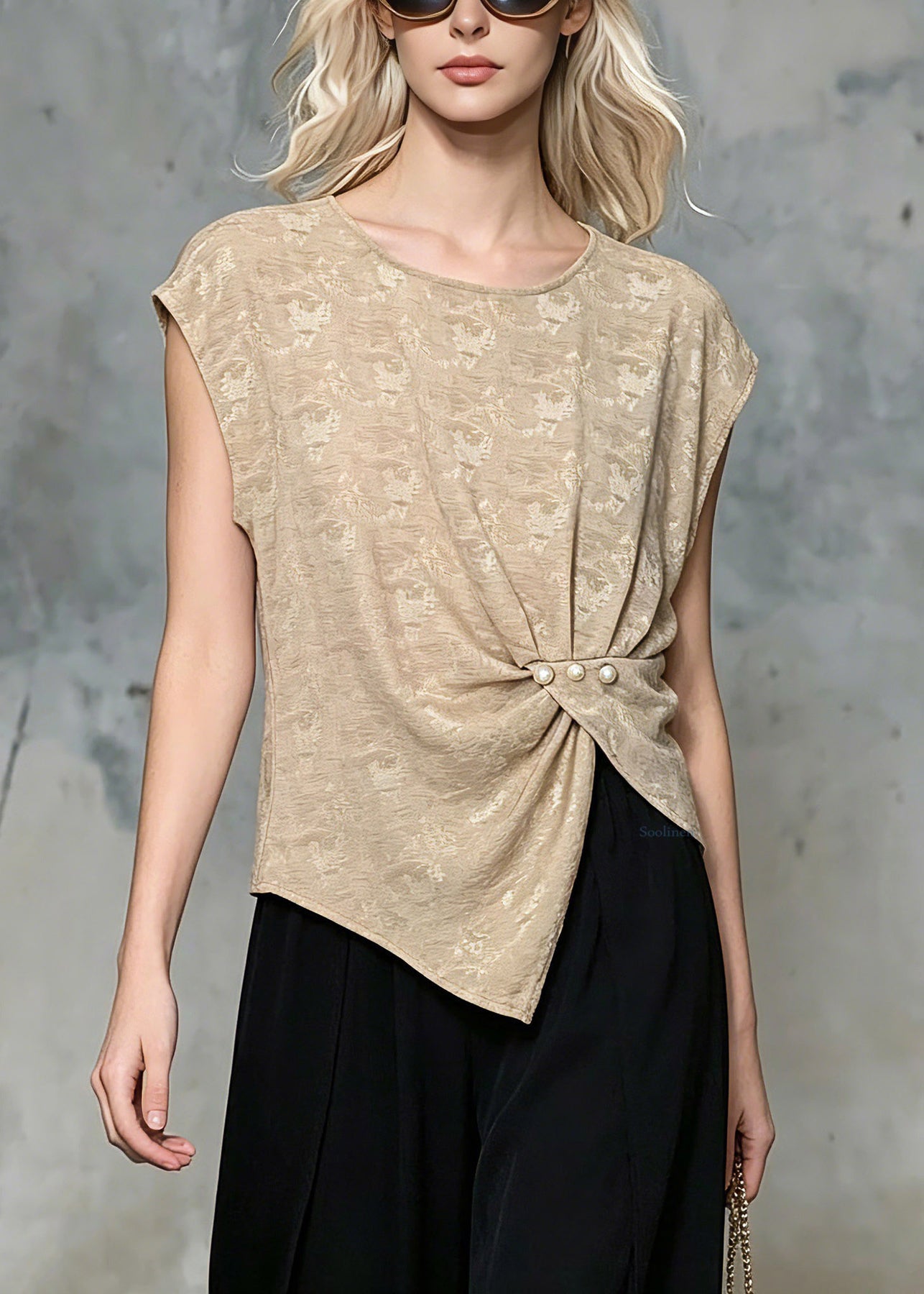 Classy Khaki Wrinkled Nail Bead Tops Short Sleeve