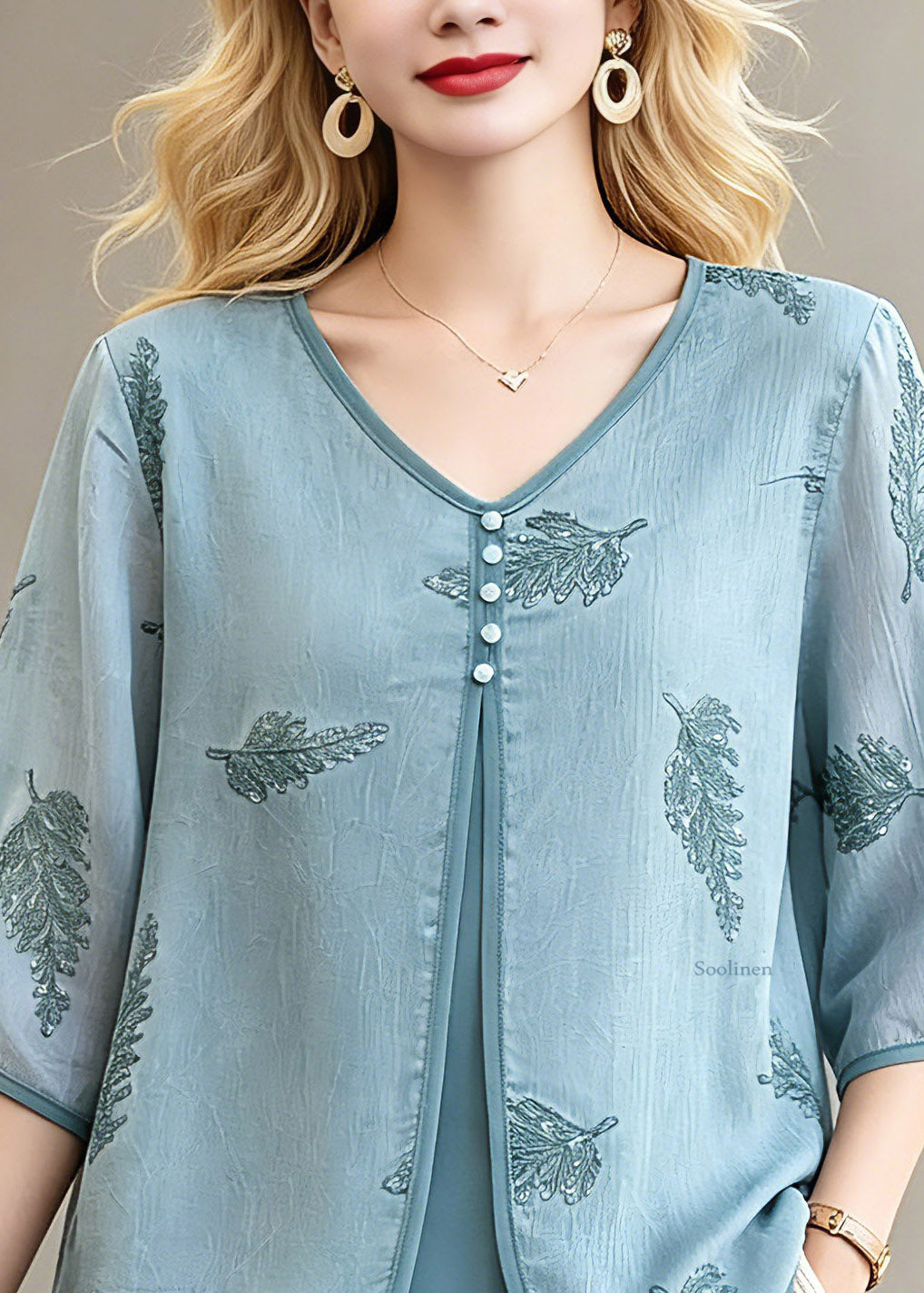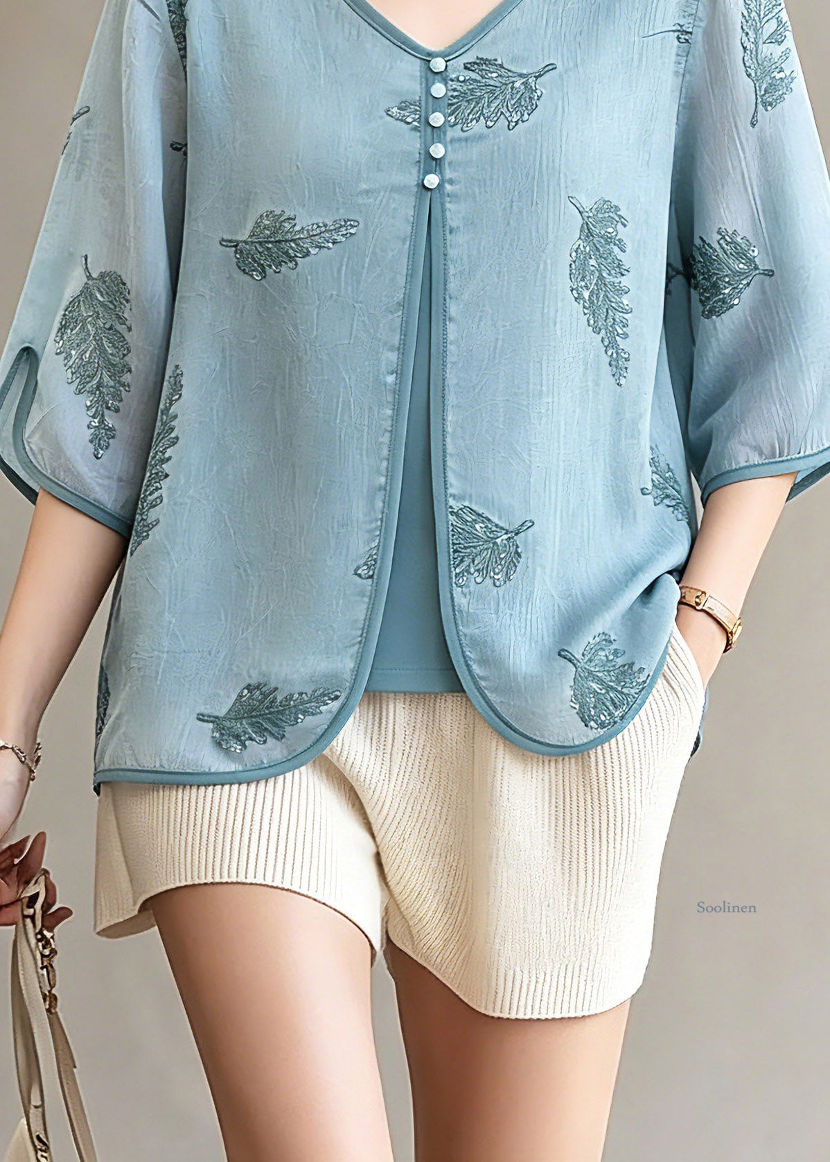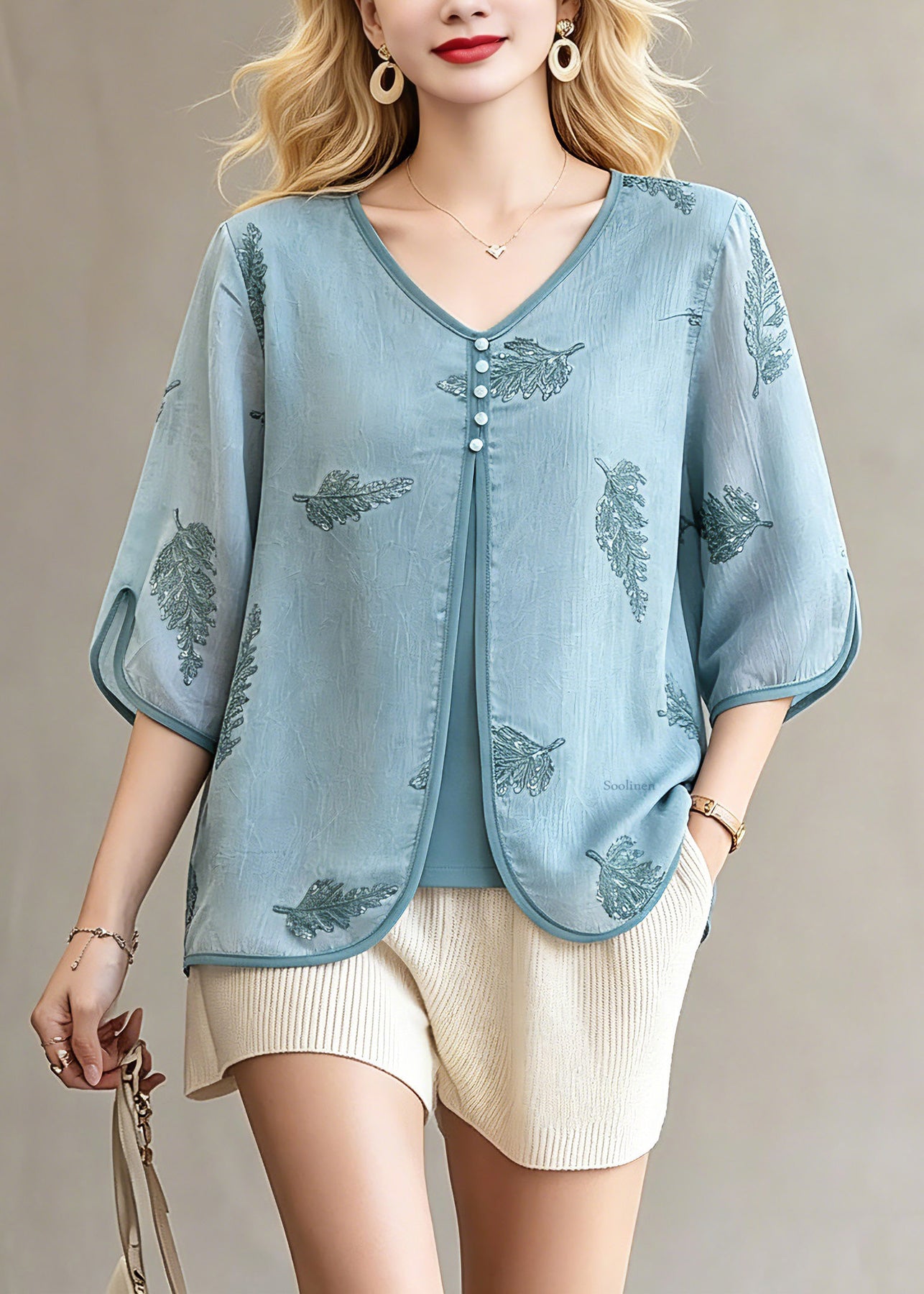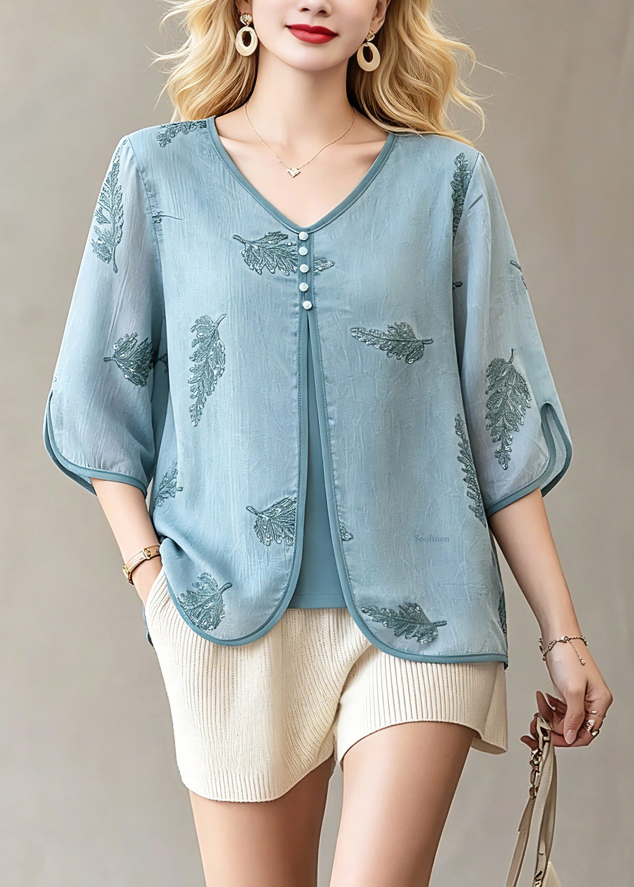 Fine Blue Button Fake Two-Piece Chiffon Tops Spring