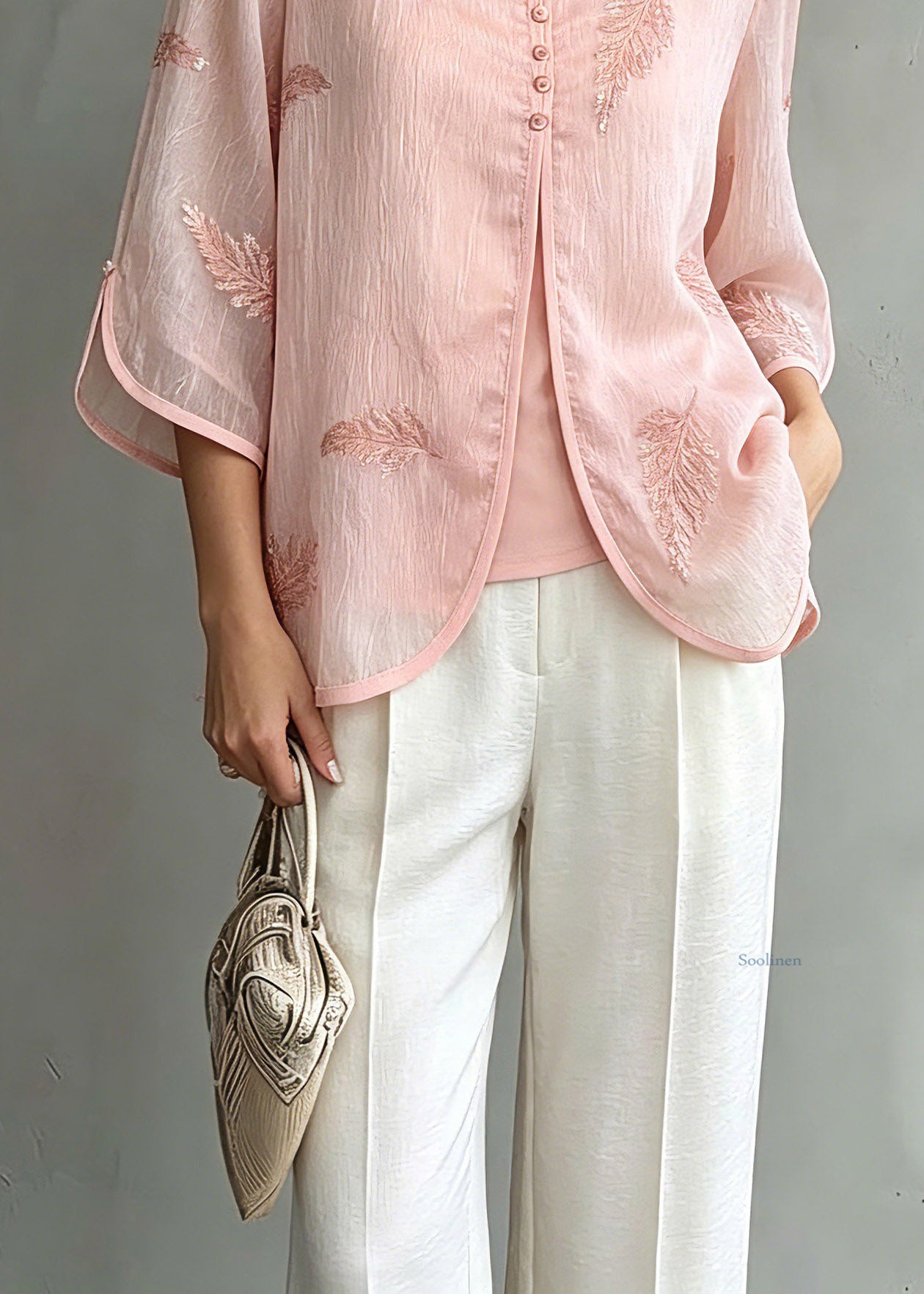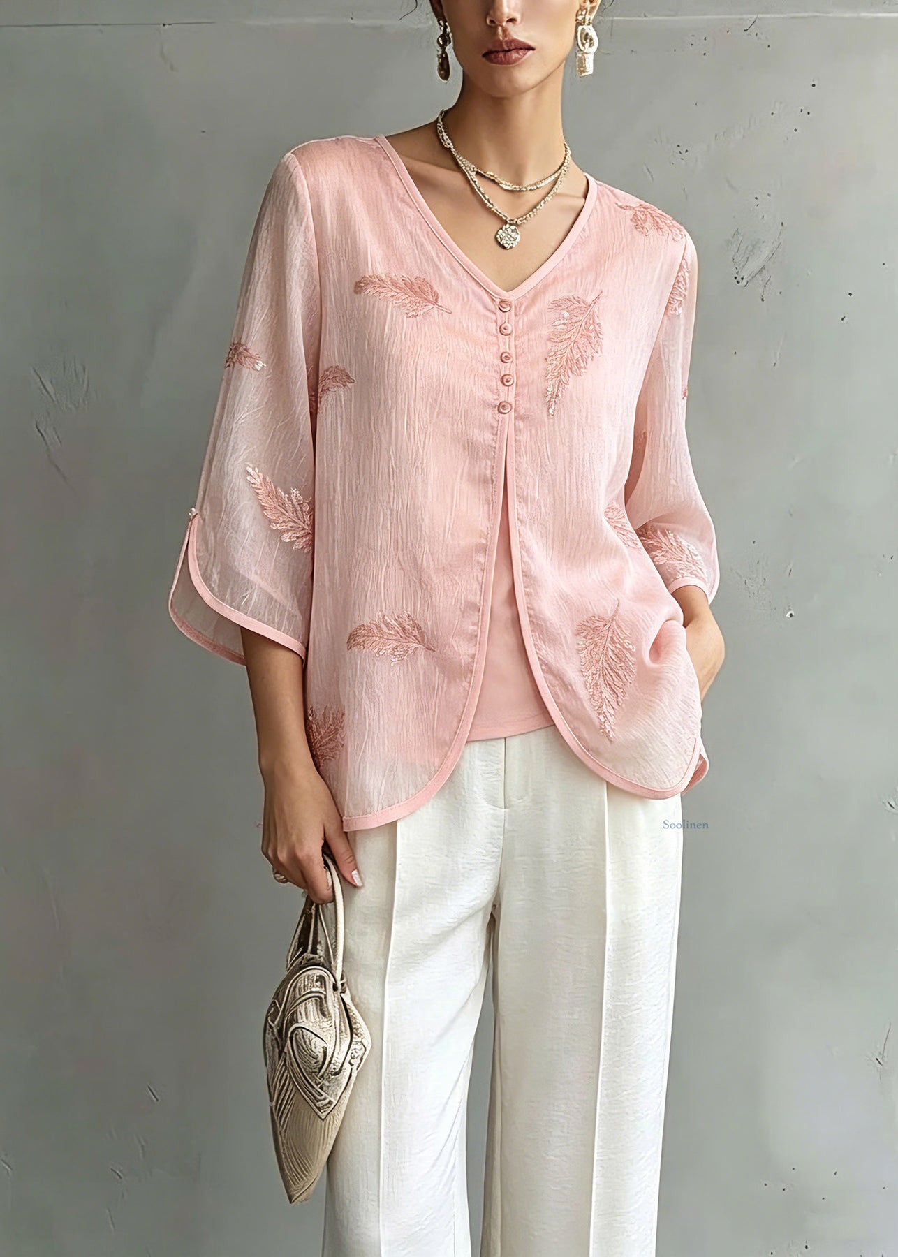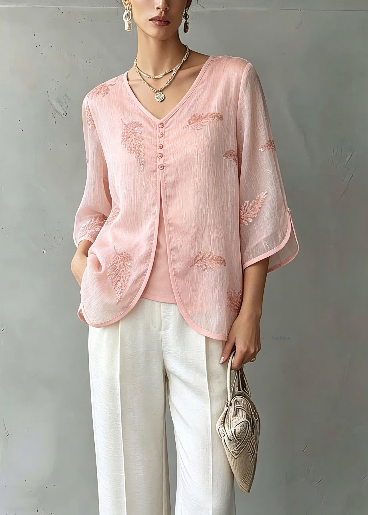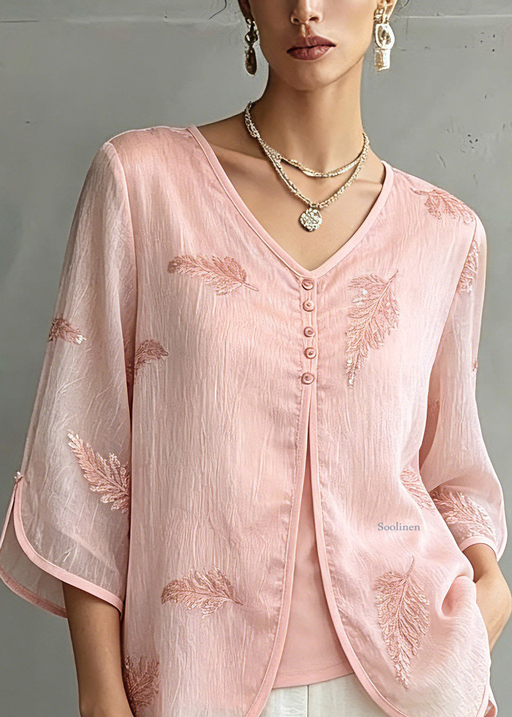 Organic Pink V Neck Print Chiffon Shirts Three Quarter Sleeve