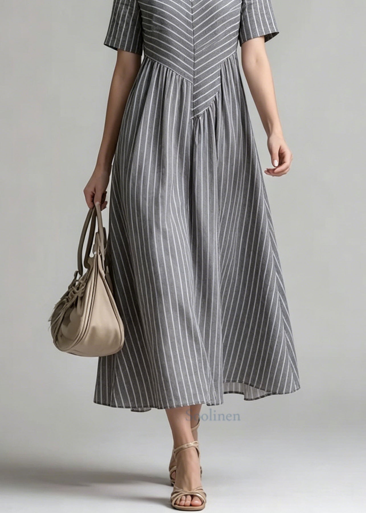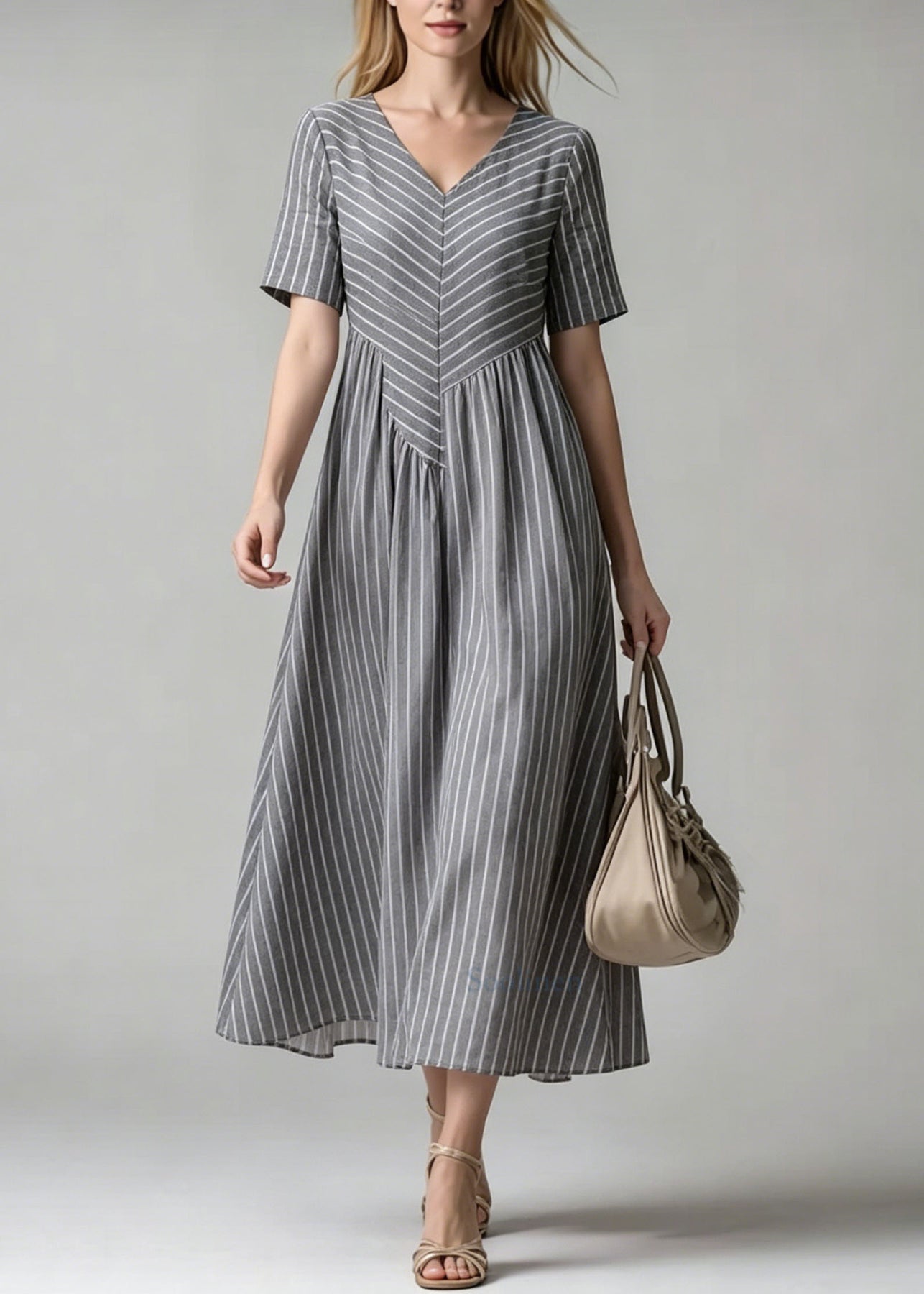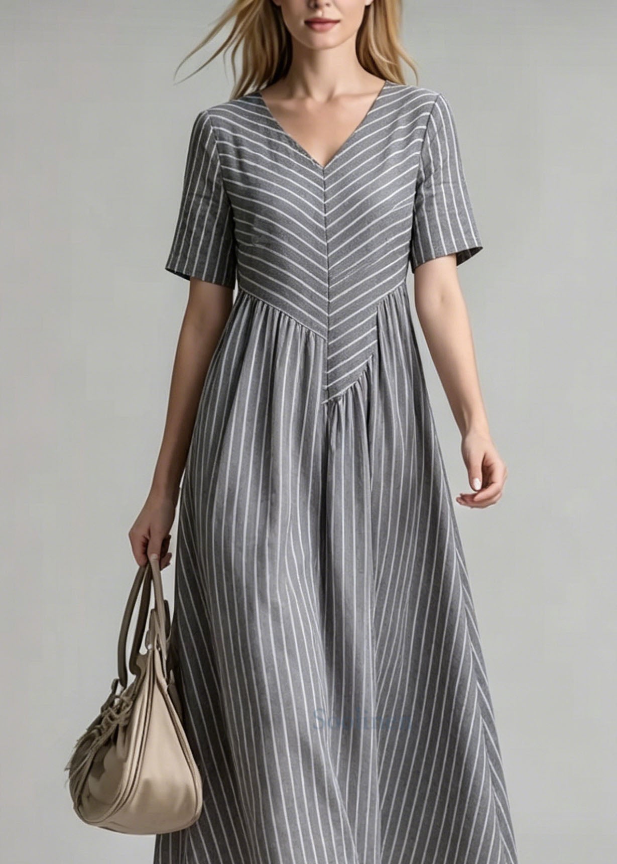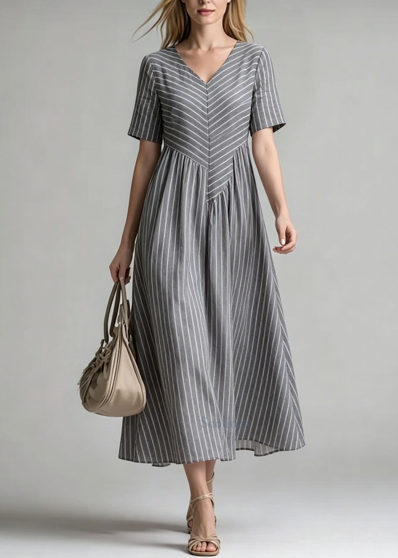 Women V Neck Striped Patchwork Cotton Dress Summer