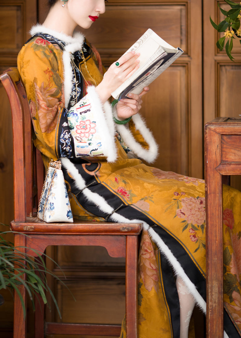 Retro Faux Fur Collar Embroideried Button Side Open Silk Cheongsam Long Sleeve