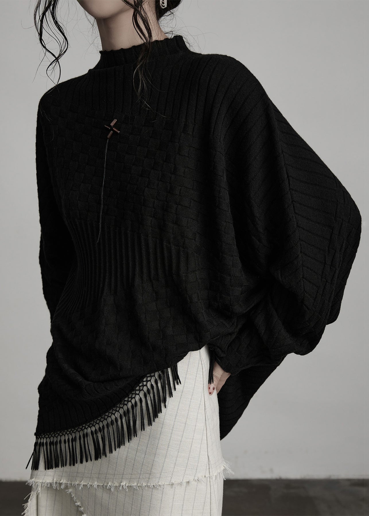 Boutique Black Tasseled Asymmetrical Woolen Knit Top Winter