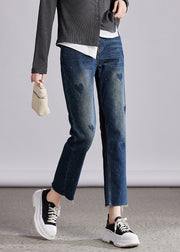 French Blue Pockets Heart Zircon Denim Straight Trousers Fall