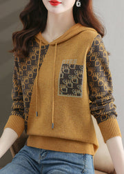 Yellow Zircon Patchwork Cotton Knit Sweaters Hooded Long Sleeve