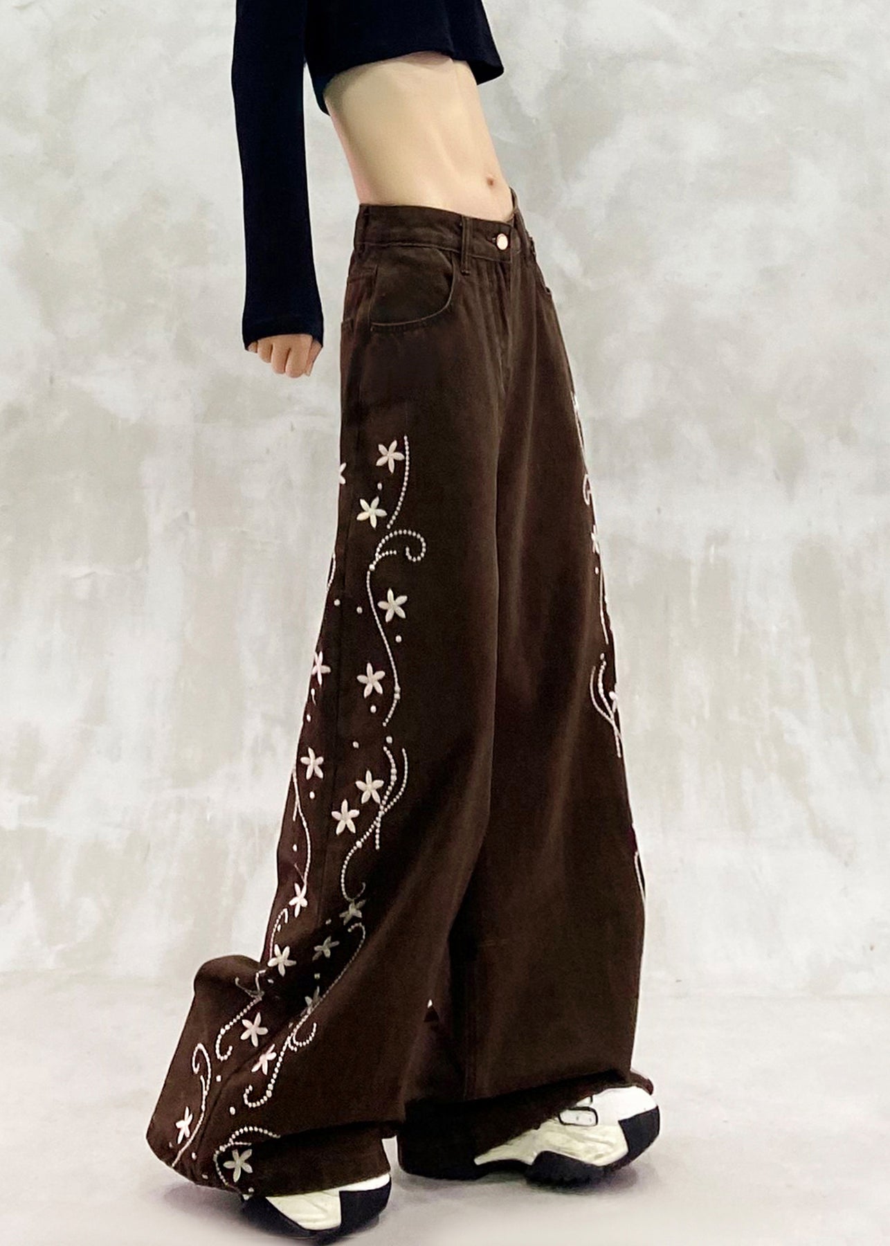 Boho Brown Oversized Print Denim Wide Leg Pants Spring