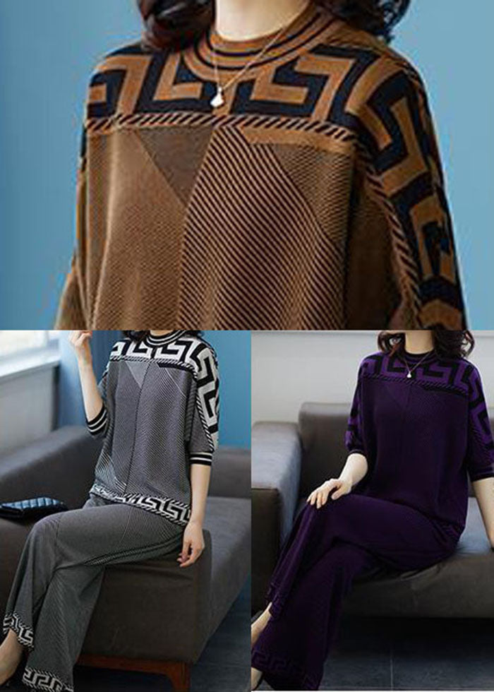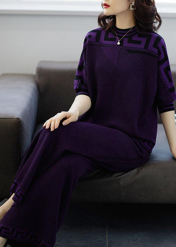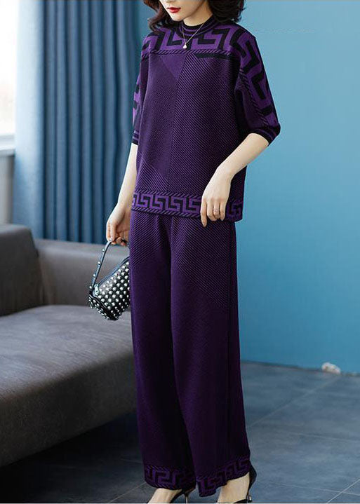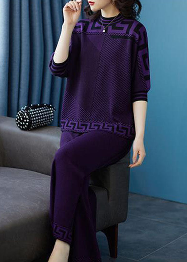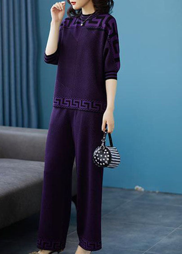 Boutique Purple O-Neck Print Draping Silk Sweatshirt Two Piece Suit Set Fall