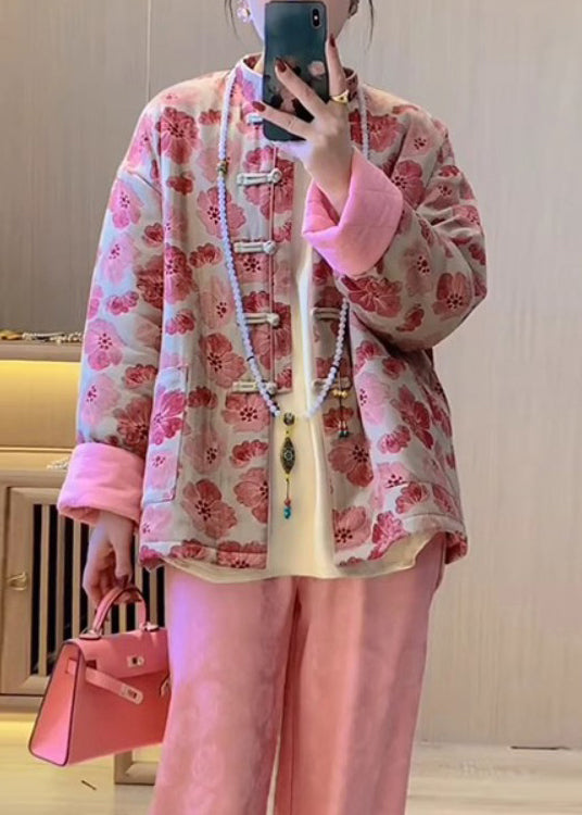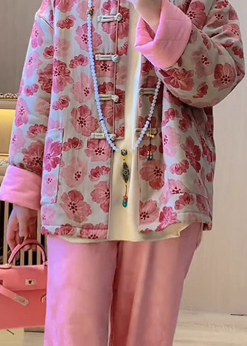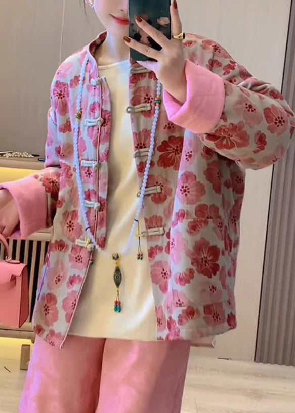 Art Pink Chinese Button Print Pockets Fine Cotton Coat Spring