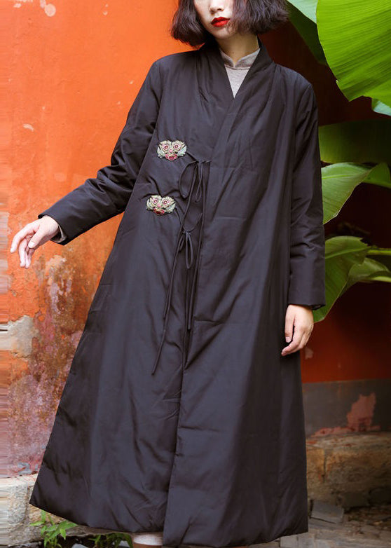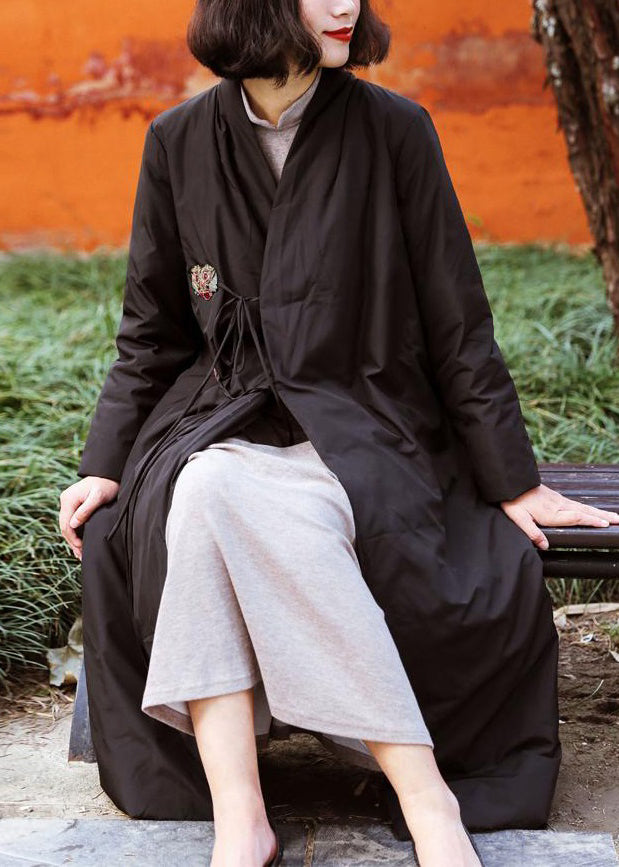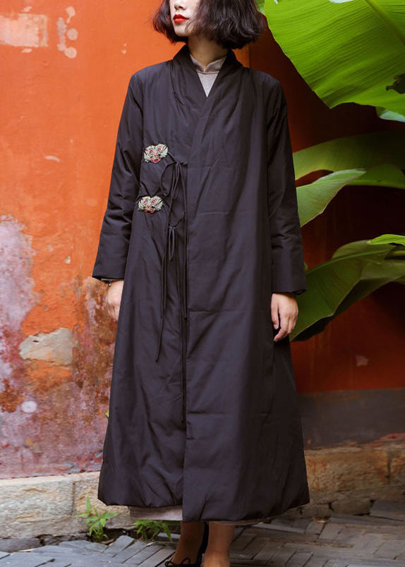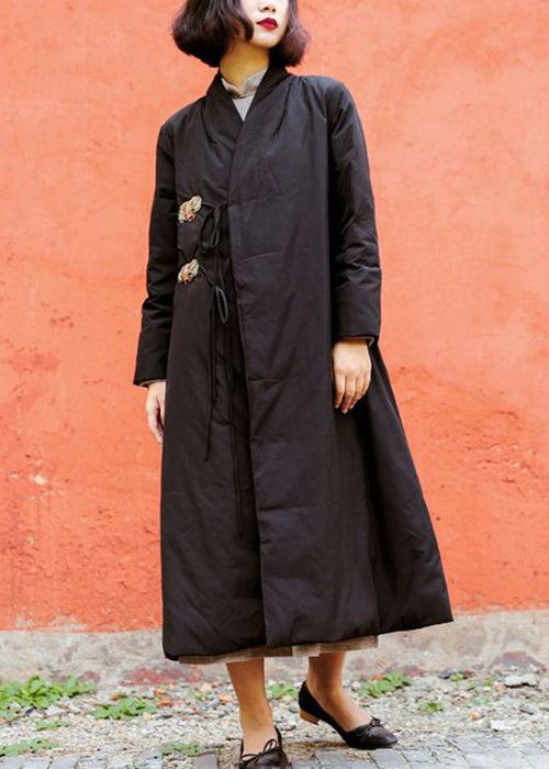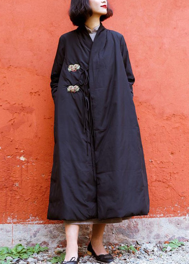 Loose Black V Neck Lace Up Pckets Fine Cotton Long Parkaer