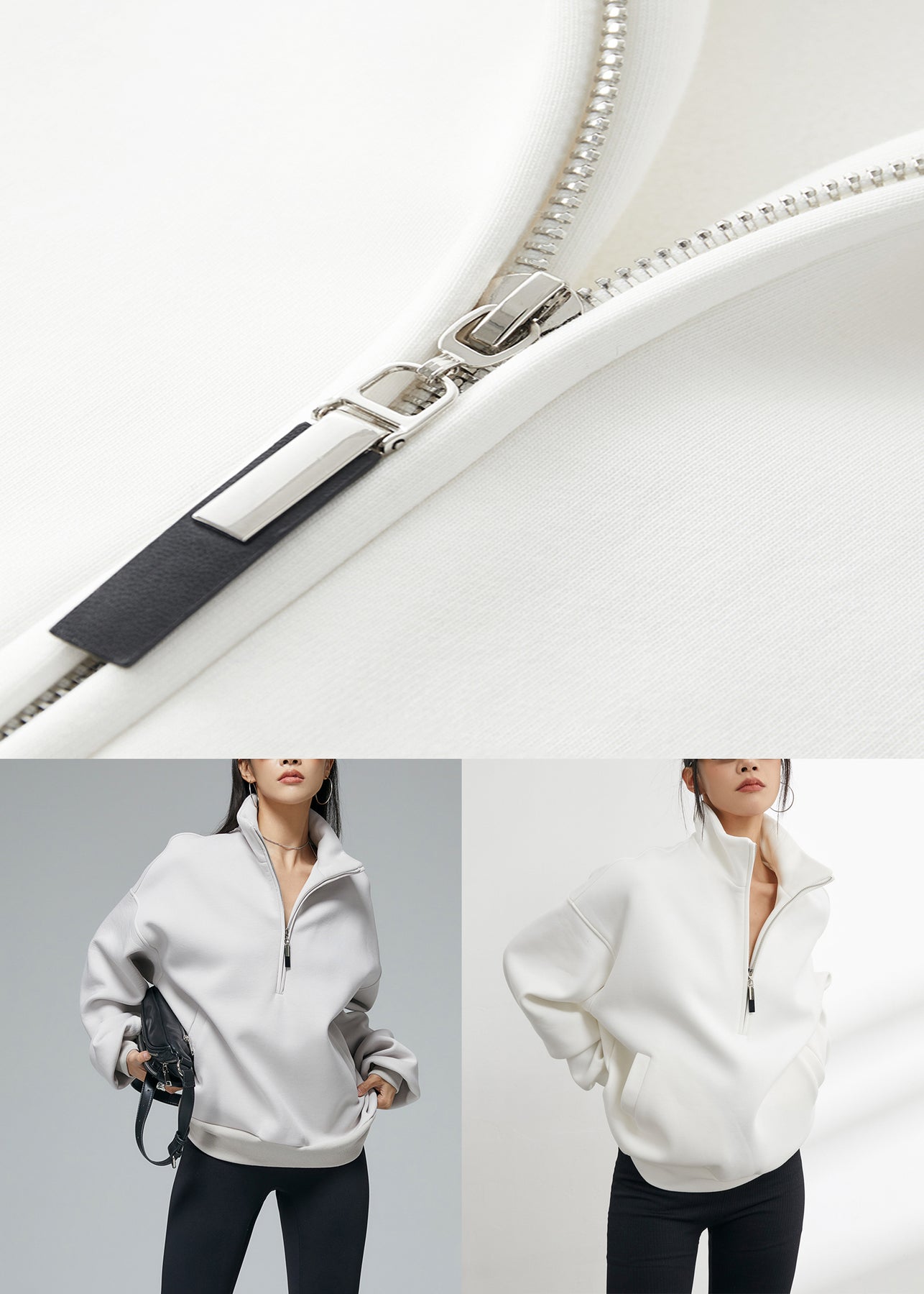Grey Zip Up Pockets Oversized Warm Fleece Winter Sweatshirt Stand Collar