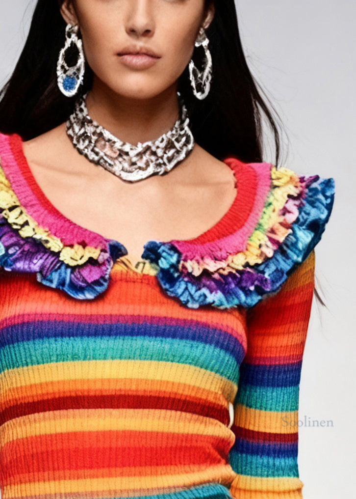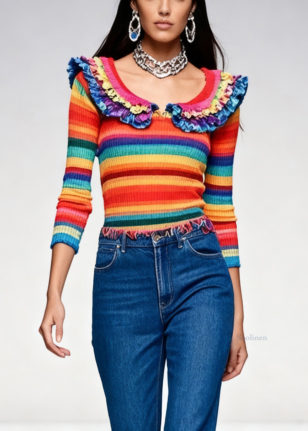 Novelty Rainbow Striped Ruffled Knit Sweaters Spring