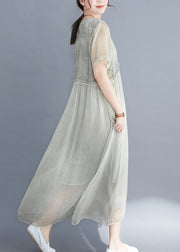 Lake Green Loose Silk Dresses O-Neck Ruffled Short Sleeve
