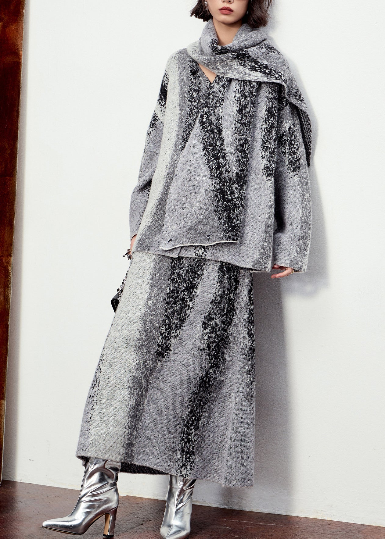 Natural Grey Button Cotton Knit Scarf,Cardigans And Maxi SkirtsThree Pieces Set Winter