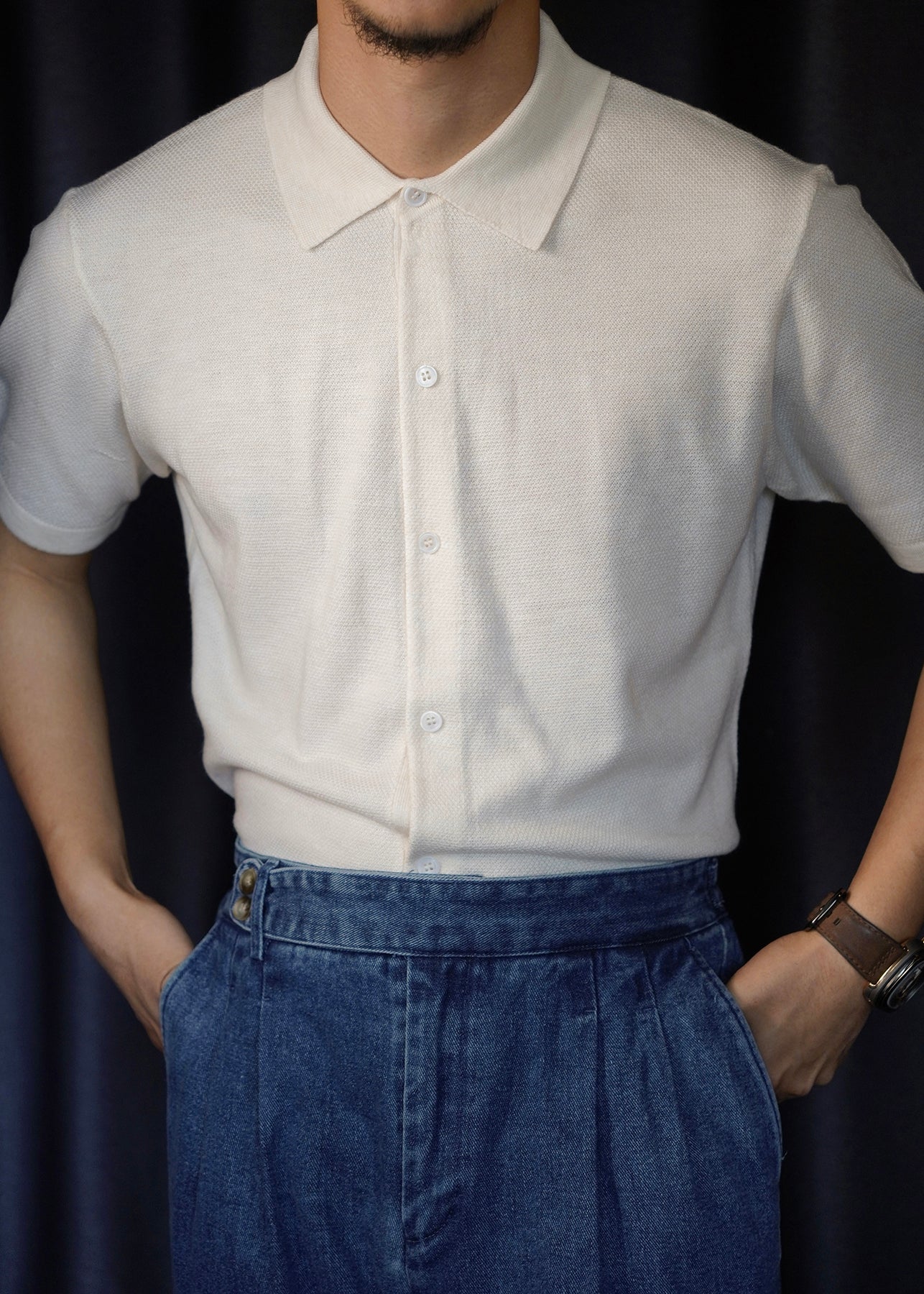 Slim Fit White Peter Pan Collar Button Knit Mens Shirt Summer