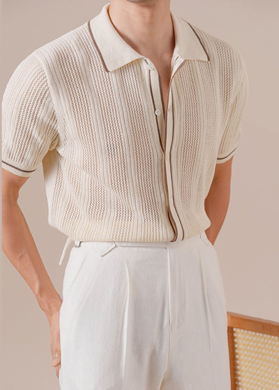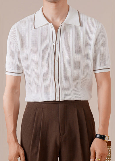 Slim Fit White Button Hollow Out Knit Mens Polo Shirts Summer
