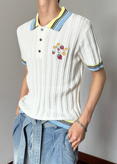 Slim Fit White Embroideried Patchwork Knit Mens Polo Shirt Summer