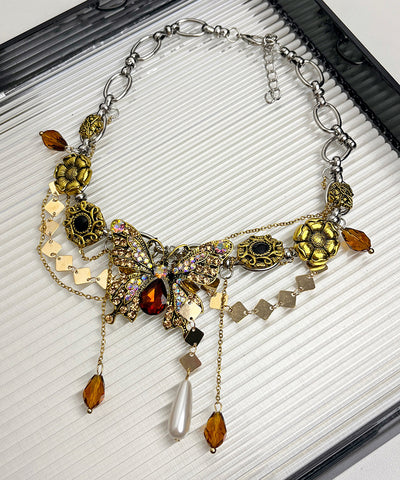 Boutique Gold Alloy Zircon Pearl Butterfly Tassel Pendant Necklace