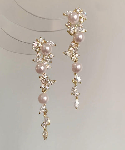 Women White Sterling Silver Overgild Zircon Pearl Stud Earrings