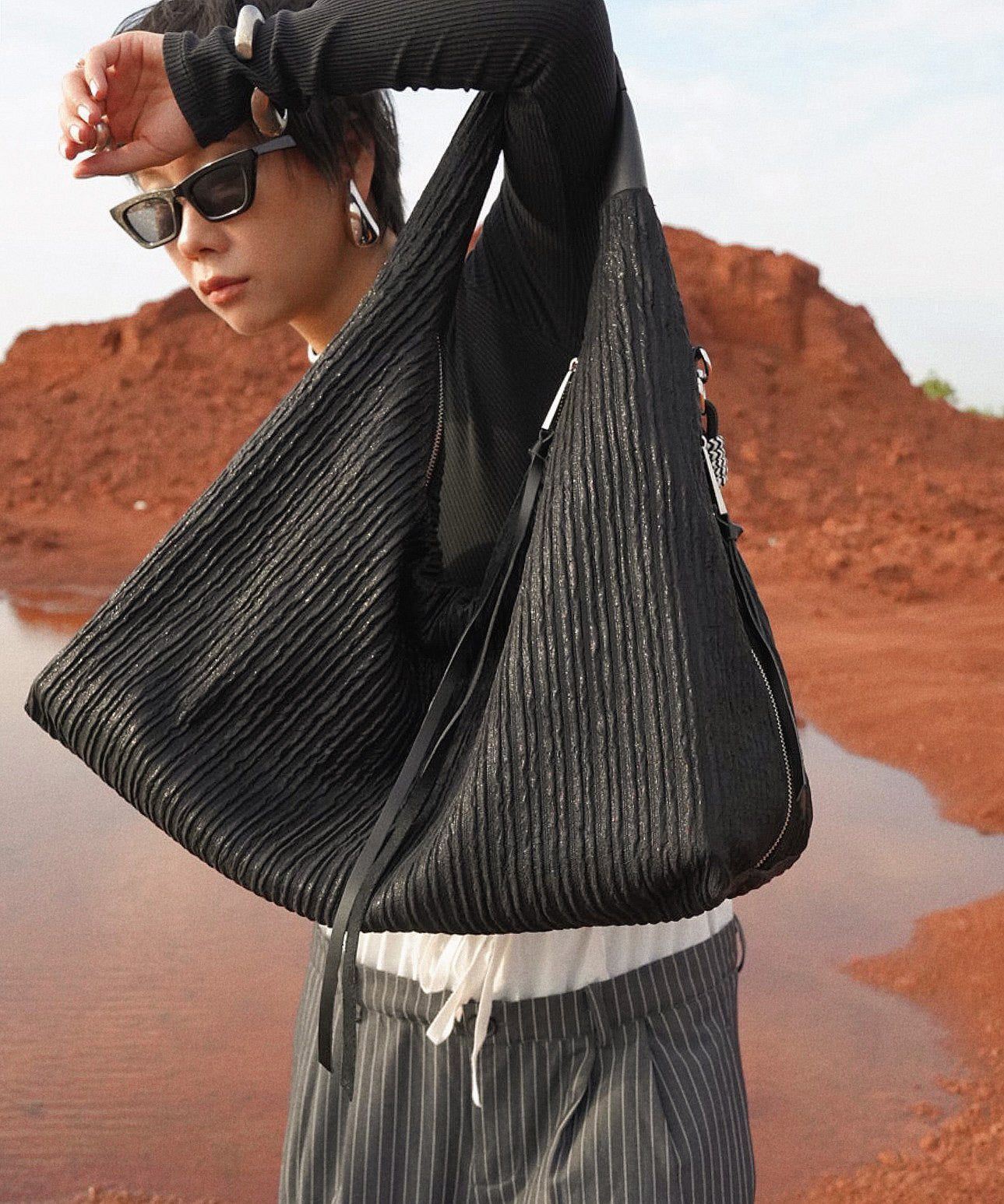 Women Black Wrinkled Large Capacity Shoulder Bag