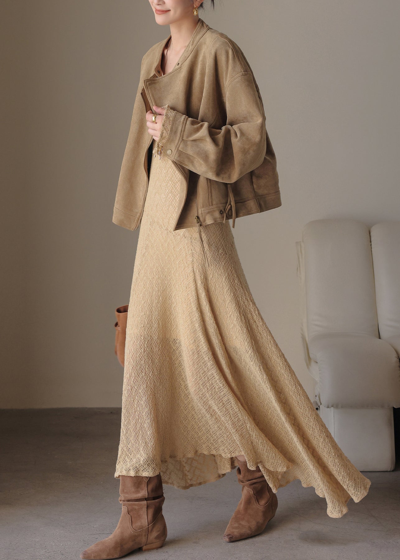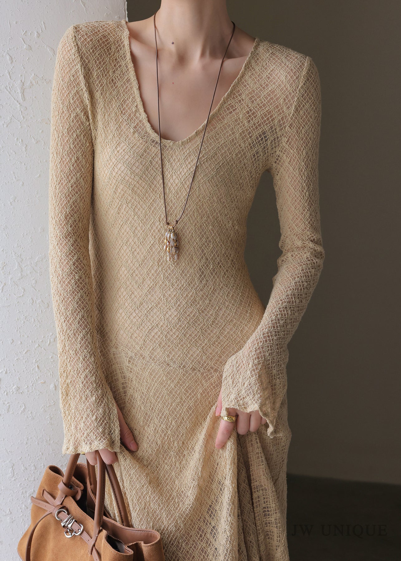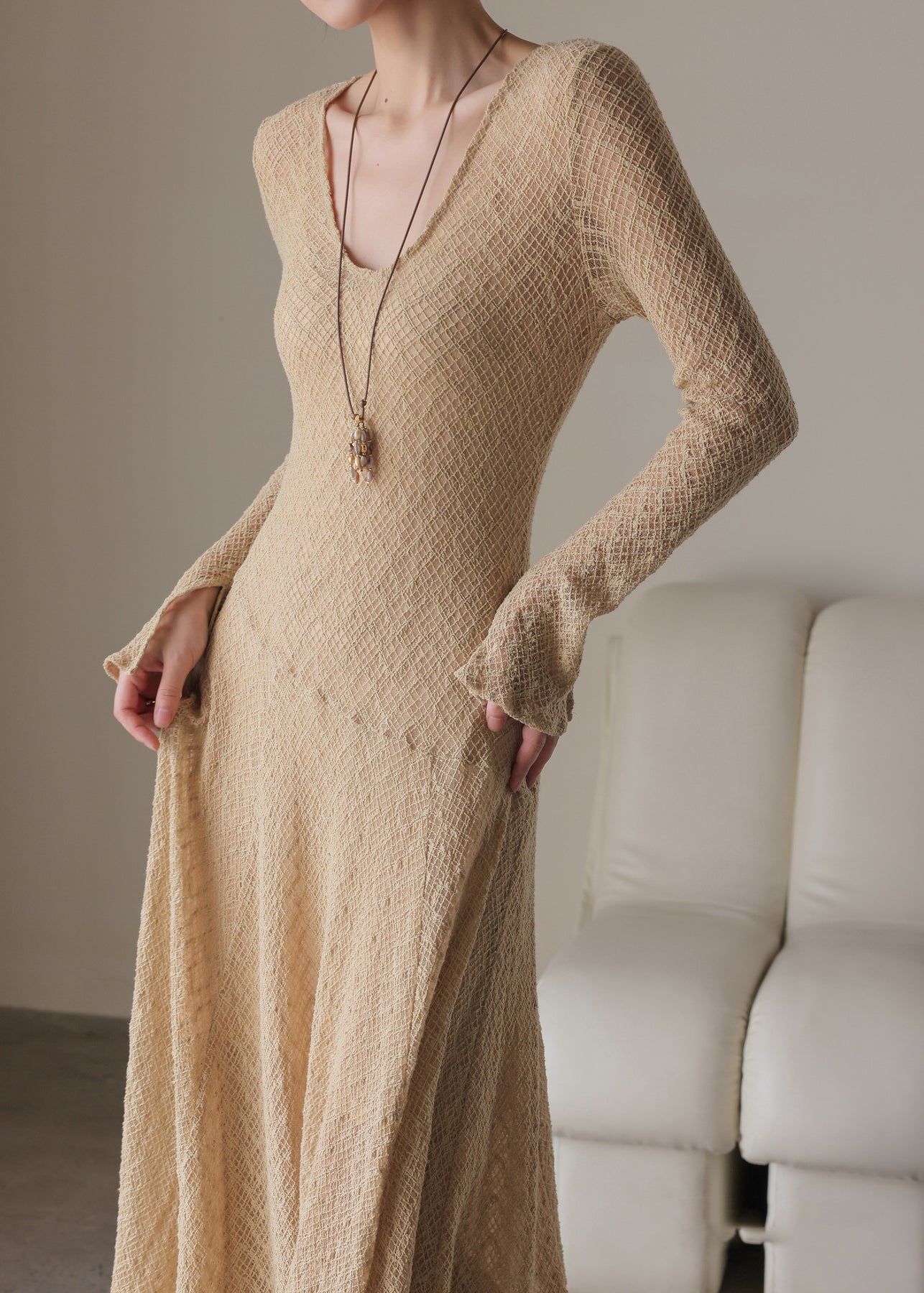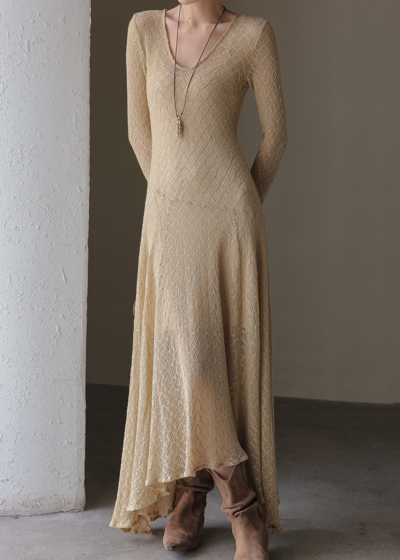 Handmade Khaki U Neck Solid Maxi Dress Spring