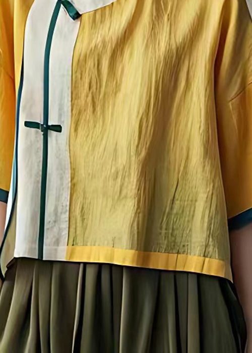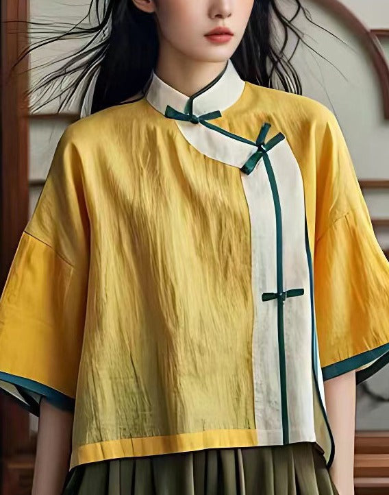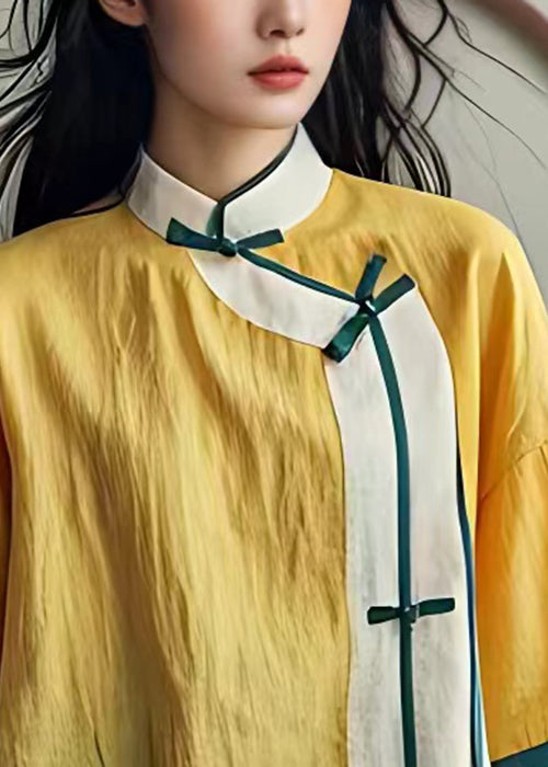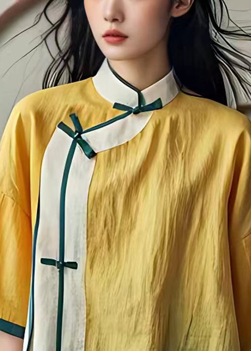 New Yellow Stand Collar Button Cotton Shirts Summer