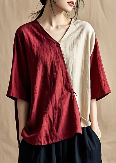 Art Red V Neck Button Patchwork Cotton Blouses Summer