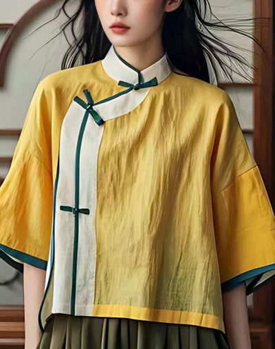 New Yellow Stand Collar Button Cotton Shirts Summer