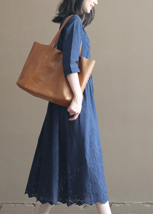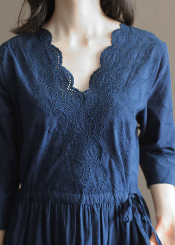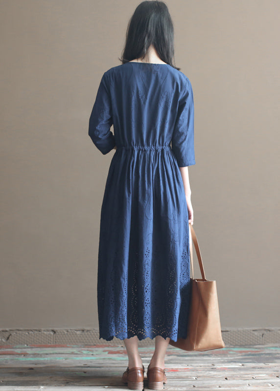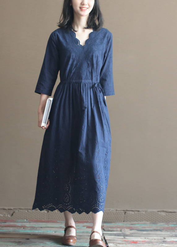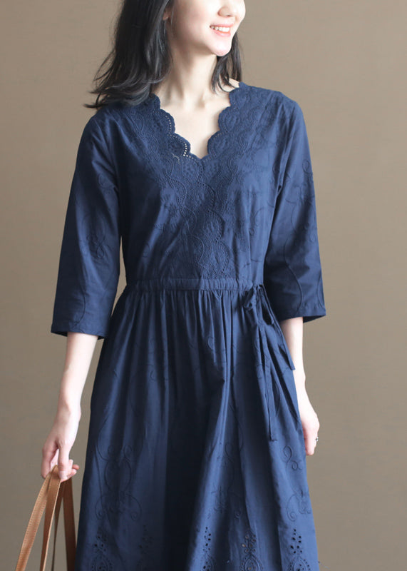 Natural Navy Drawstring V Neck Embroideried Cotton Long Dress Bracelet Sleeve
