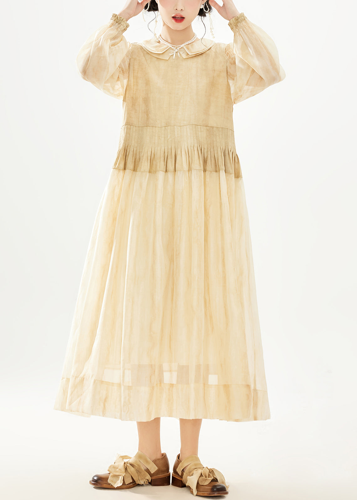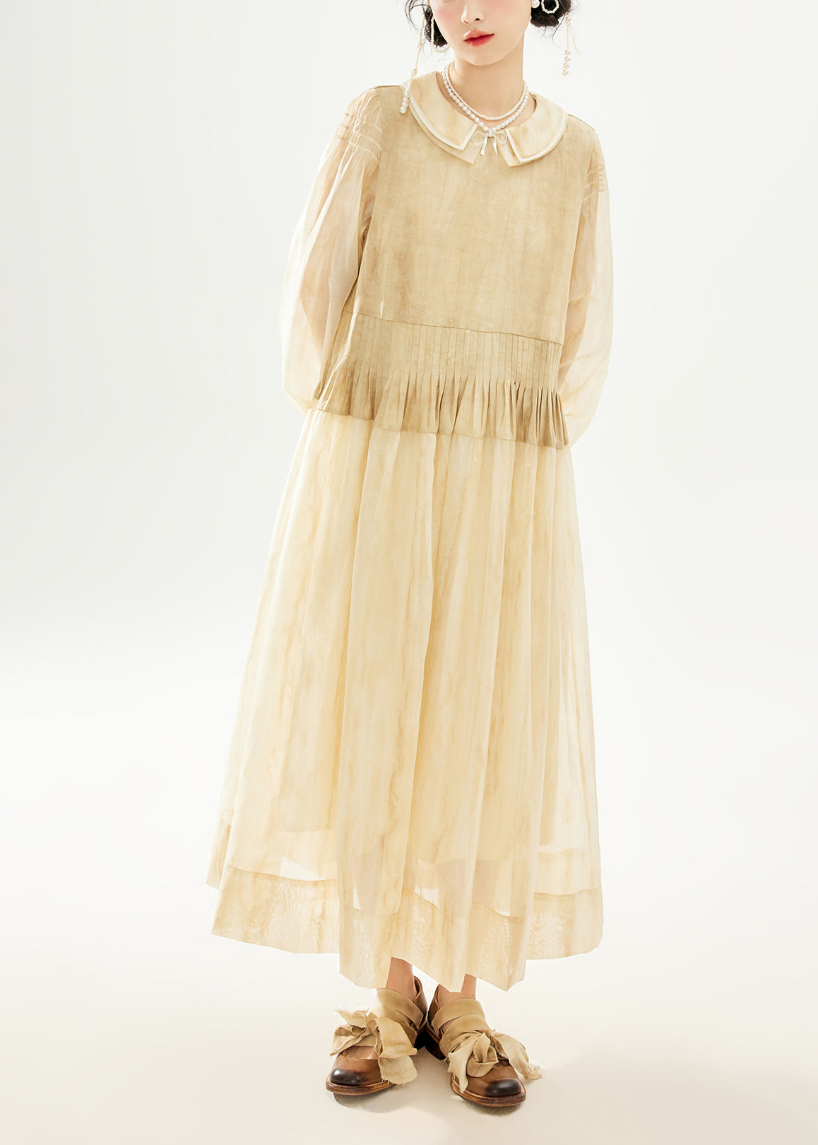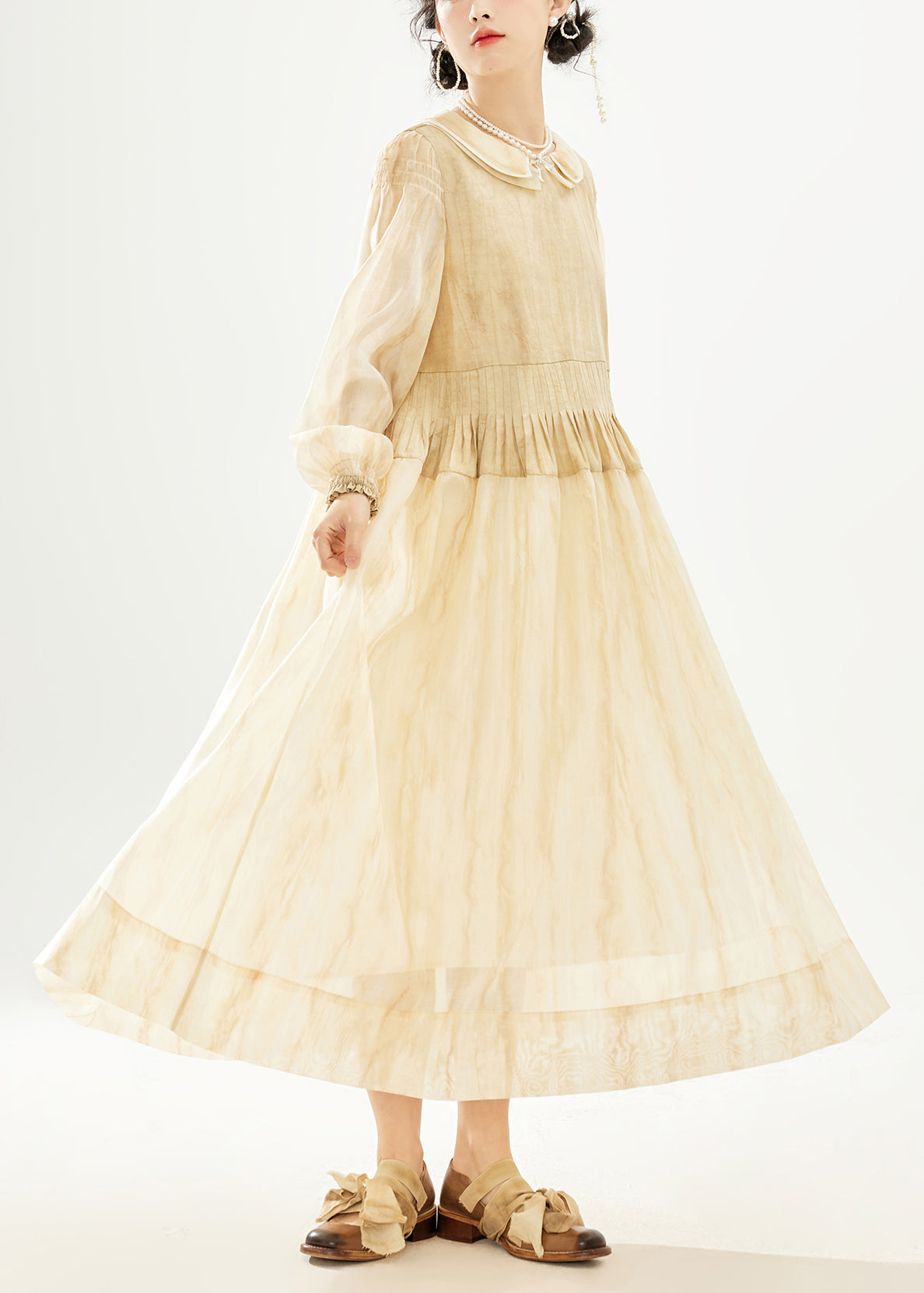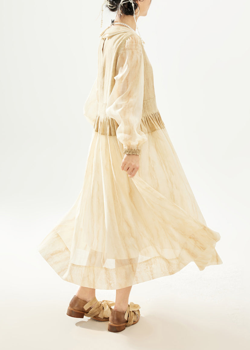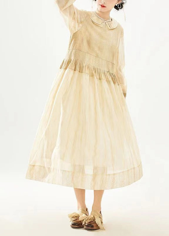 Women Khaki Double Layer Wrinkled Patchwork Cotton Long Dress Long Sleeve