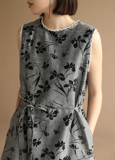 Slim Fit Grey Print Tie Waist Pockets Vacation Dresses Sleeveless