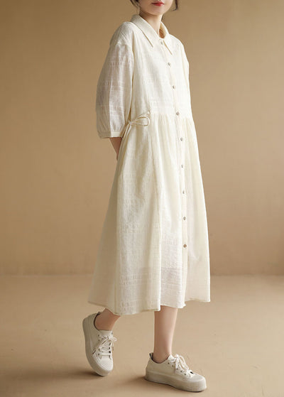 Women Beige Peter Pan Collar Wrinkled Drawstring Long Dresses Bracelet Sleeve