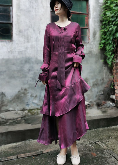 Elegant Maroon Asymmetrical Design Patchwork Ruffles Chiffon Dress Long Sleeve