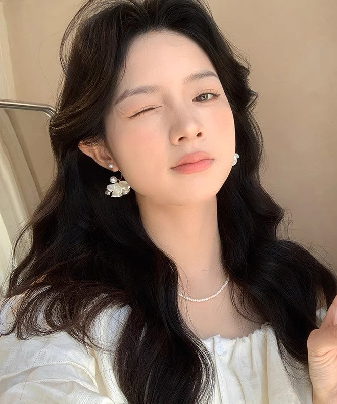 Classy White Sterling Silver Overgild Pearl Floral Drop Earrings