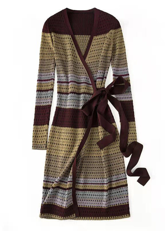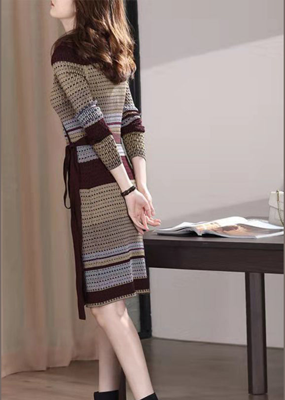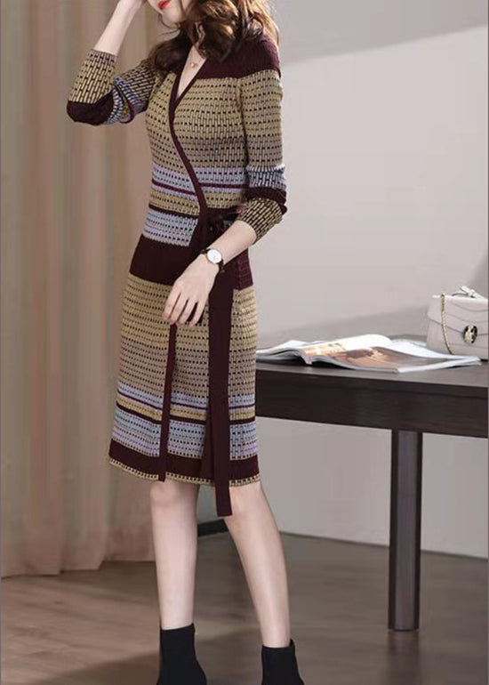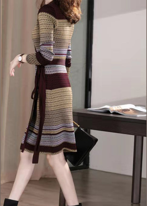 Slim Fit V Neck Print Tie Waist Knit Mid Dresses Long Sleeve