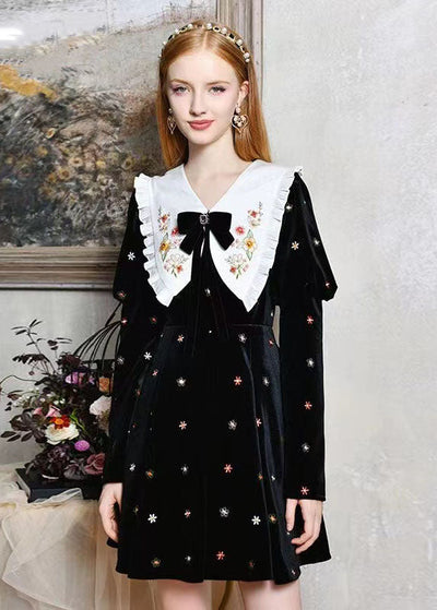 DIY Black Bow Collar Embroideried Silk Velour Dresses Spring
