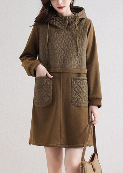 Modern Khaki Hooded Patchwork Pockets Cotton Loose Sweatshirt Dress Spring