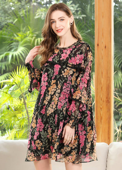 Loose Black O-Neck Ruffled Print Chiffon Maxi Dress Spring