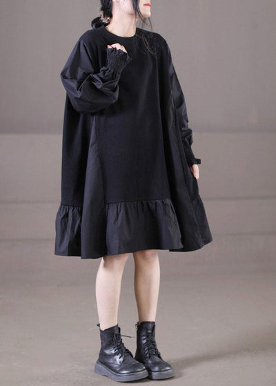 Handmade Black O-Neck Wrinkled Patchwork Ruffles Cotton Mid Dress Lantern Sleeve