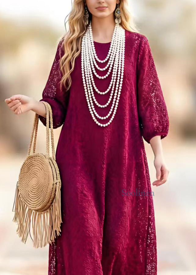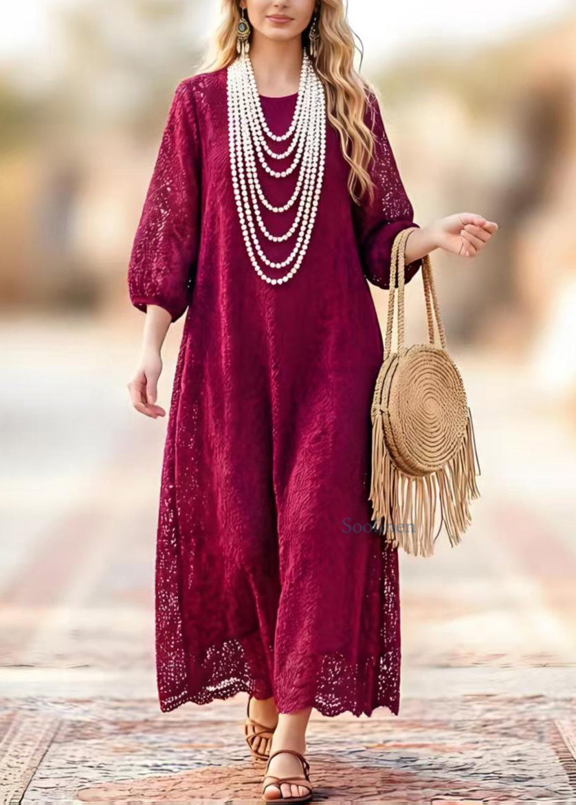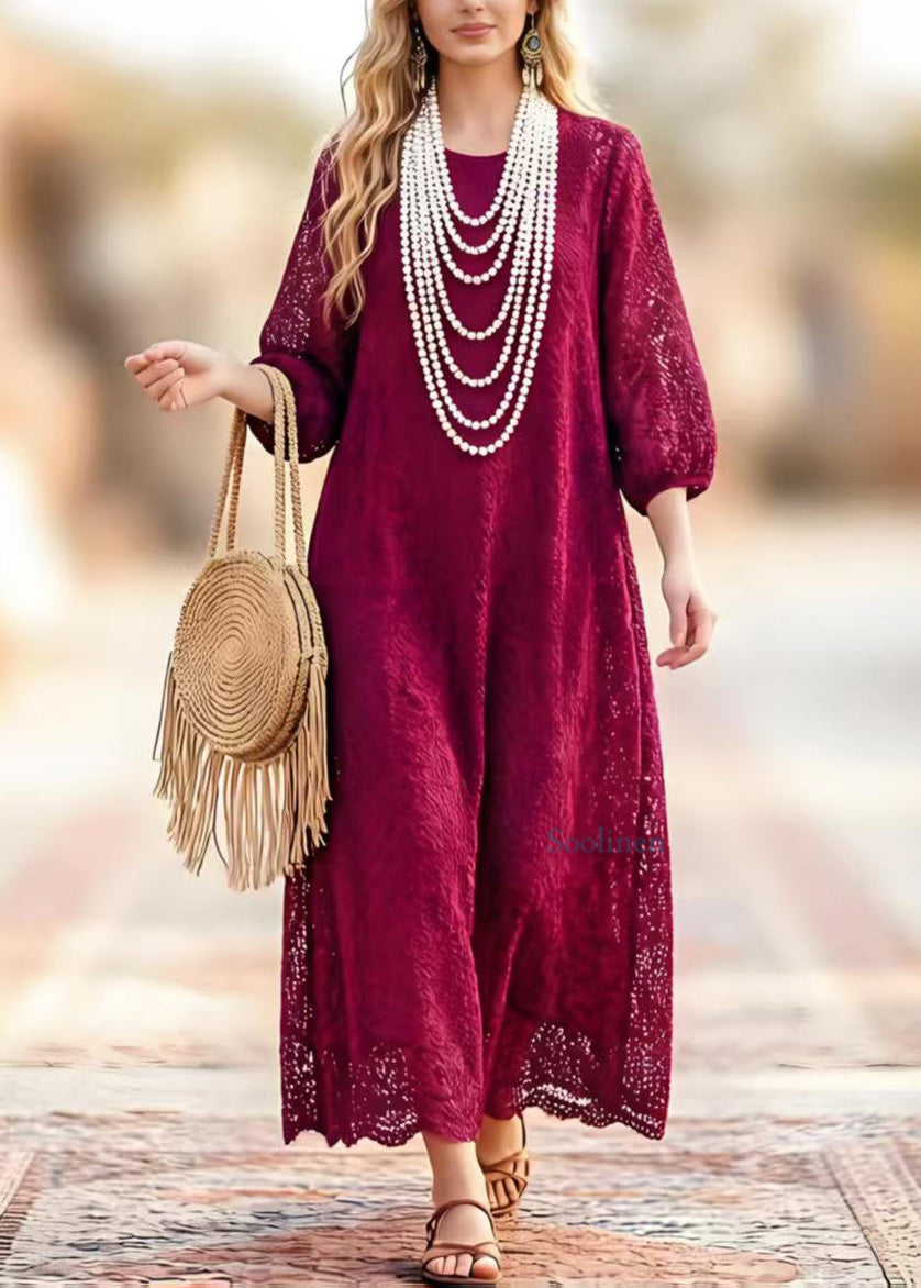 New Dark Purple O Neck Hollow Out Lace Dresses Summer