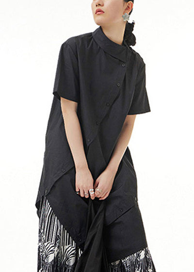 Black Asymmetrical Button Solid Cotton Maxi Shirts Short Sleeve