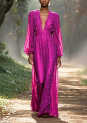Art Pitaya Color V Neck Jacquard Chiffon Vacation Dress Spring