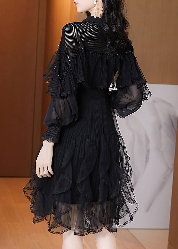 French Black Ruffled Asymmetrical Patchwork Tulle Dress Spring