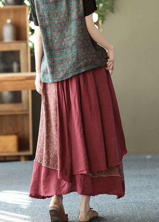 Casual Brick Red Print Asymmetrical Patchwork Cotton Skirt Spring