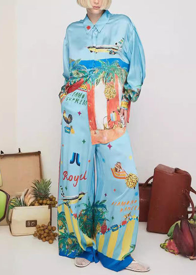 New Pink Print Shirts And Wide Leg Pants Two Pieces Set Summer