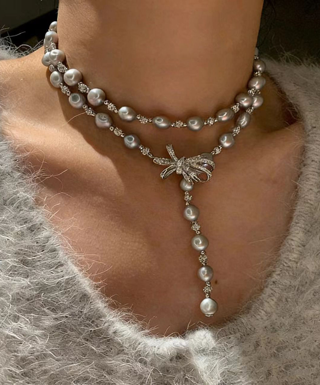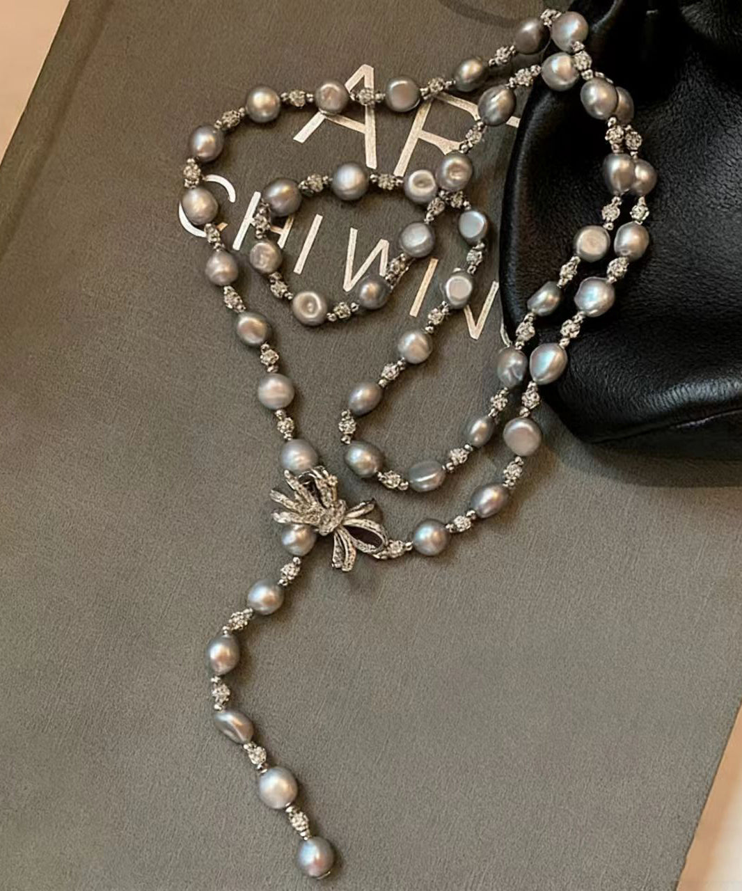Elegant Grey Bow Multi-layer Pearl Necklace