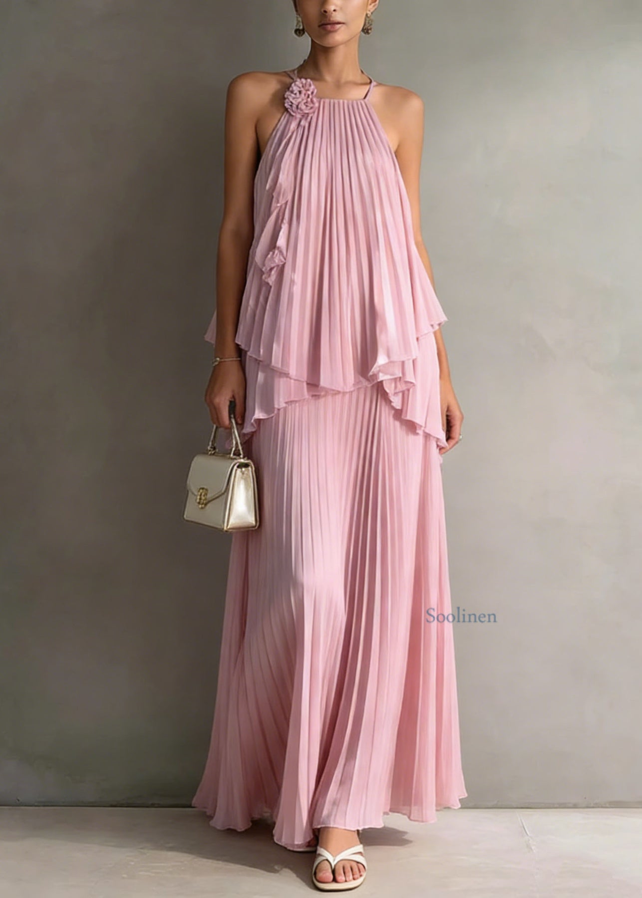 Holiday Style Pink Pleated Top And Skirts Chiffon Two Pieces Set Summer