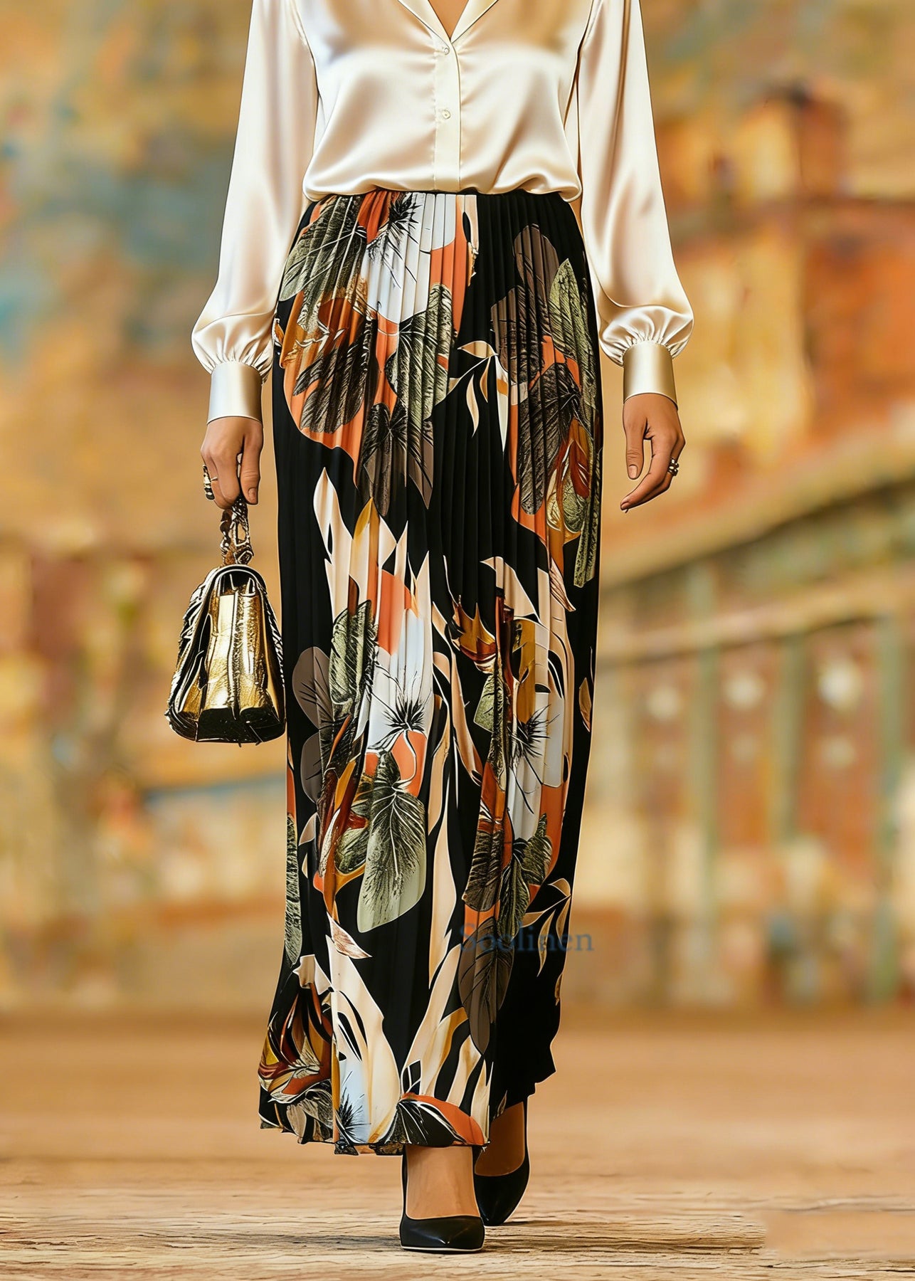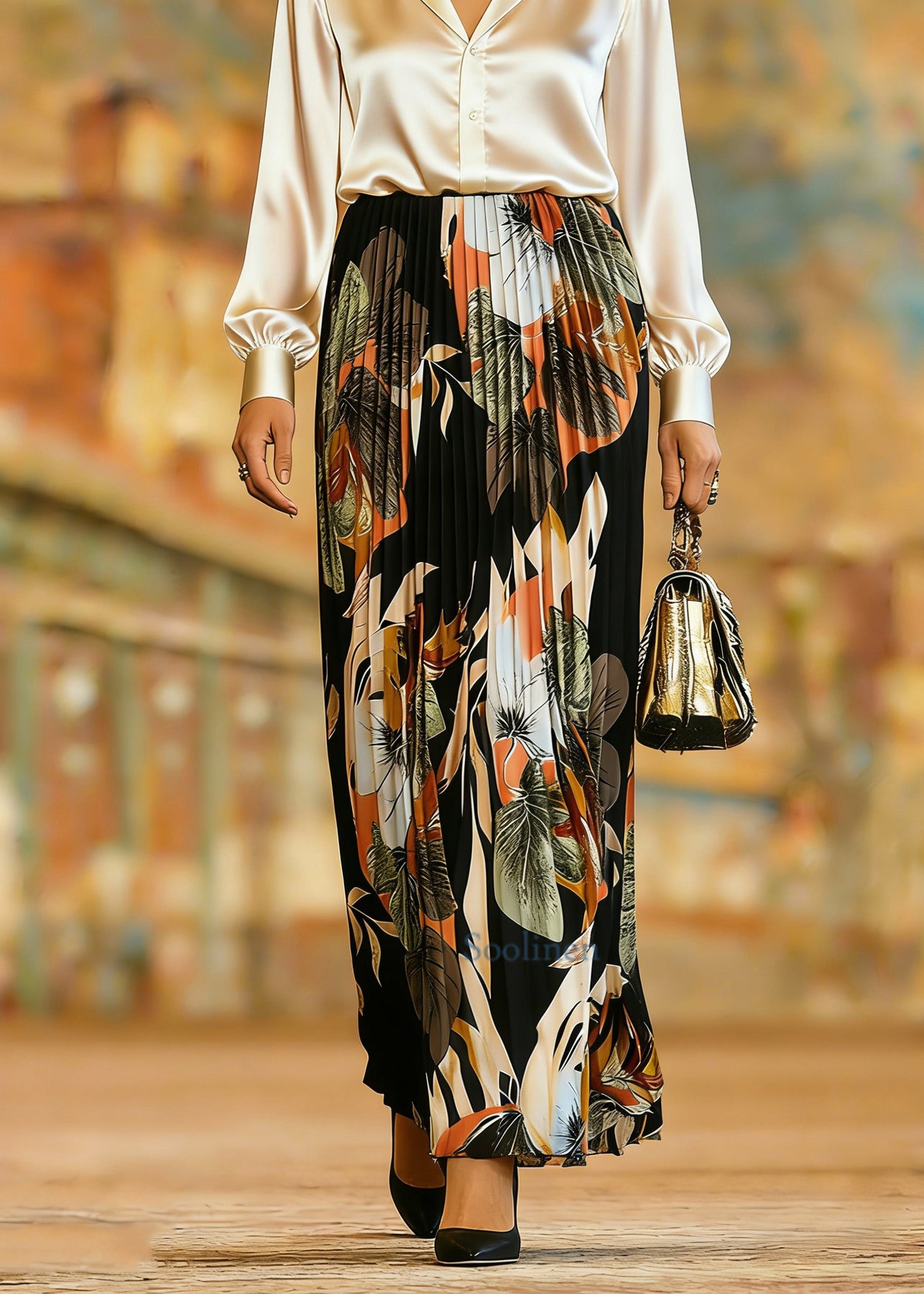 Organic Black Print Elastic Waist Pleate Skirts Spring