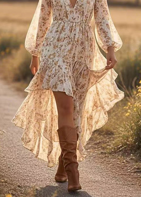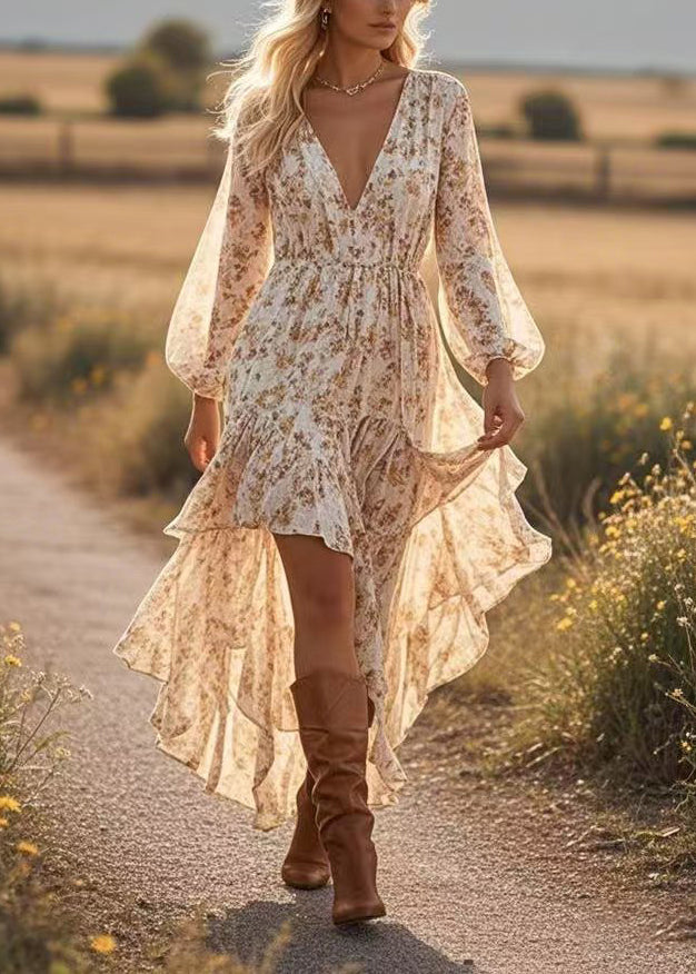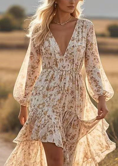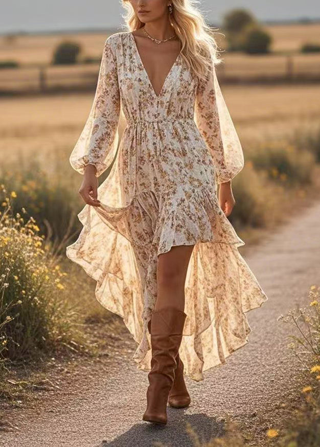 Fashion Apricot Asymmetrical Print Cotton Robe Dresses Spring