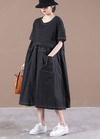 Plus Size Black O-Neck Patchwork Striped Cotton Long Dress Short Sleeve