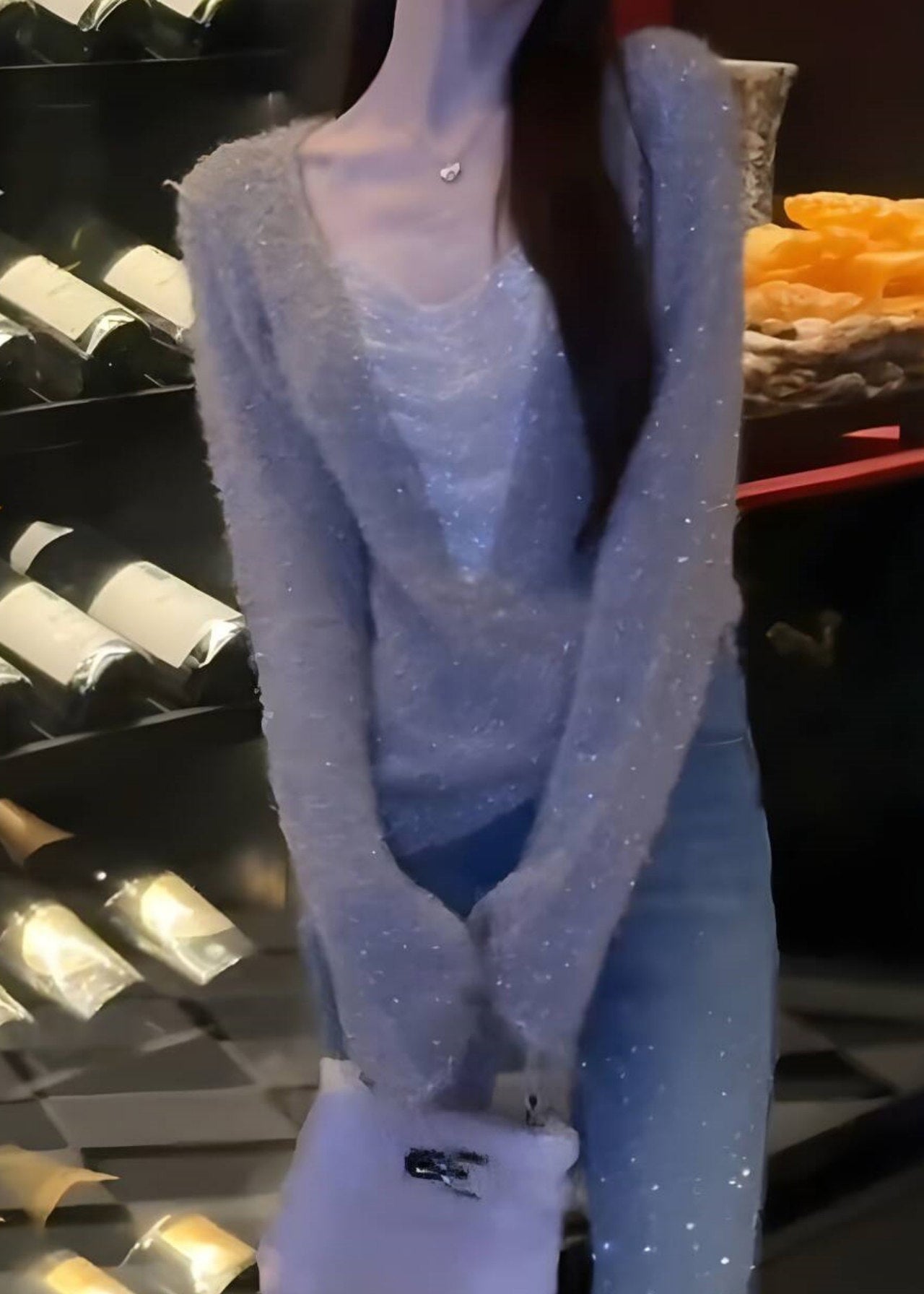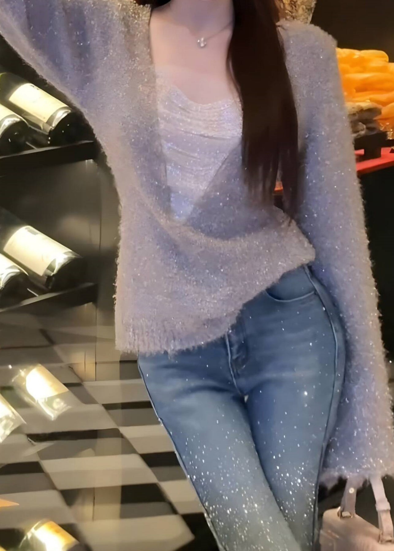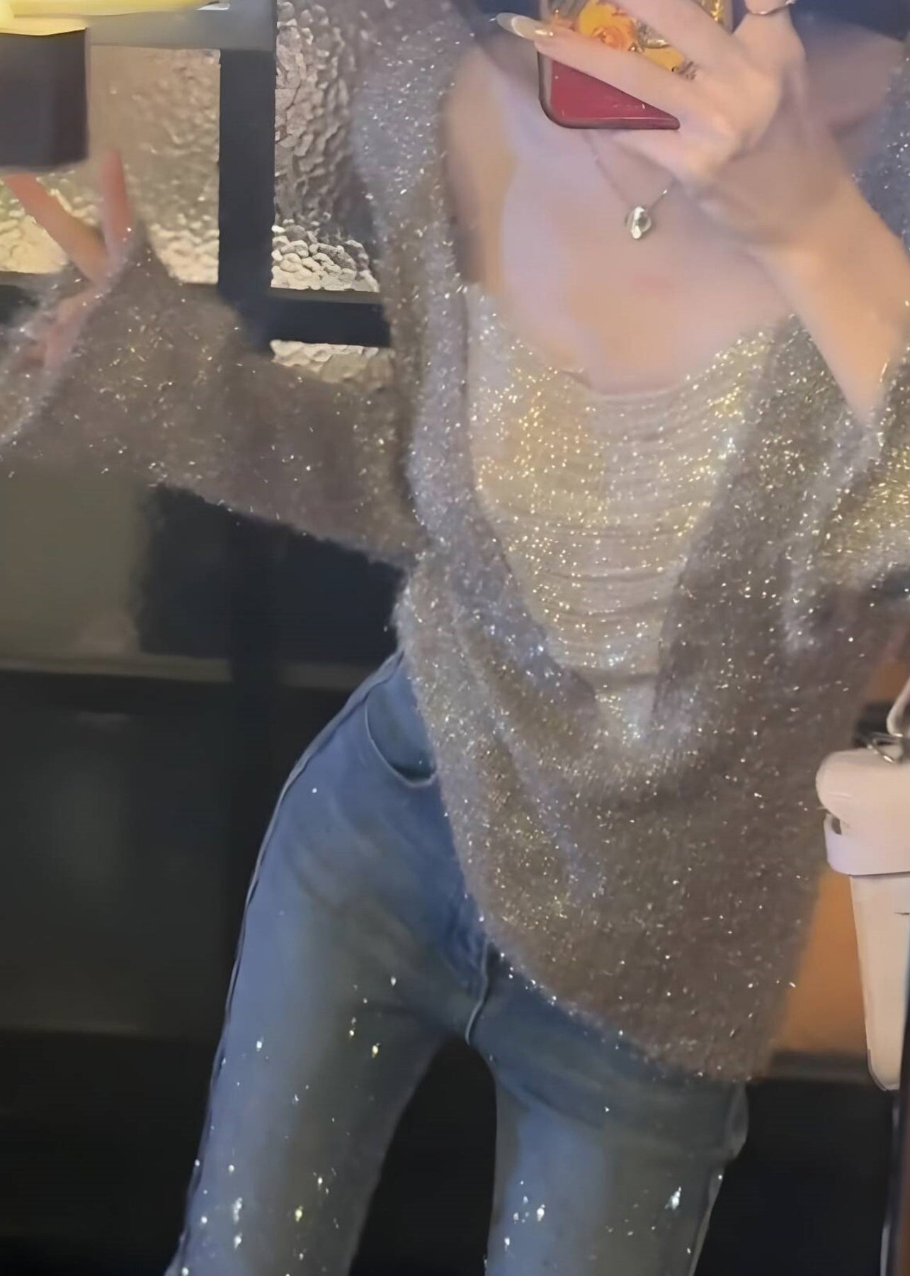 Silver Stringing Beads Patchwork Knit Sweaters V Neck Spring
