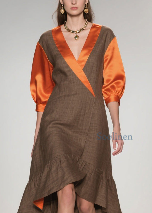 Elegant V Neck Ruffled Silk Patchwork Cotton Dresses Summer